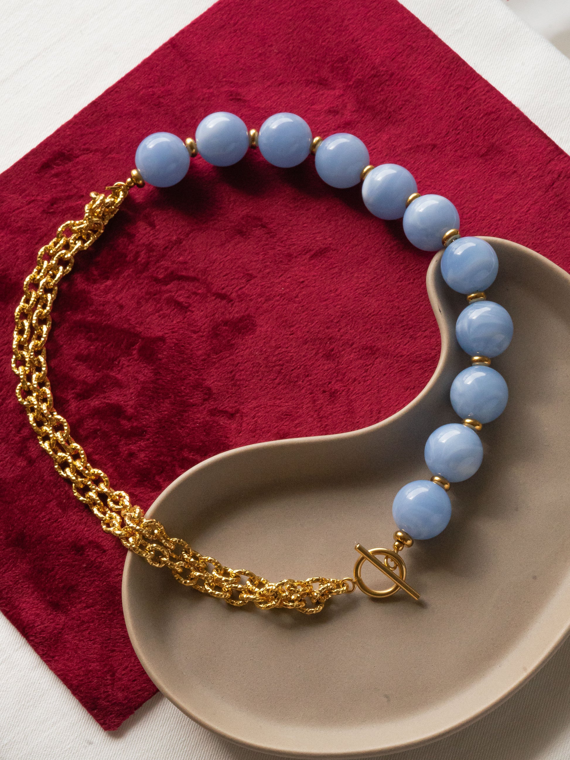 Le collier Billie est fabriqué à la main dans mon atelier. Il est composé d’une double chaine aux maillons striés, de perles dorées, de perles en résine, ainsi que d’un fermoir barre,