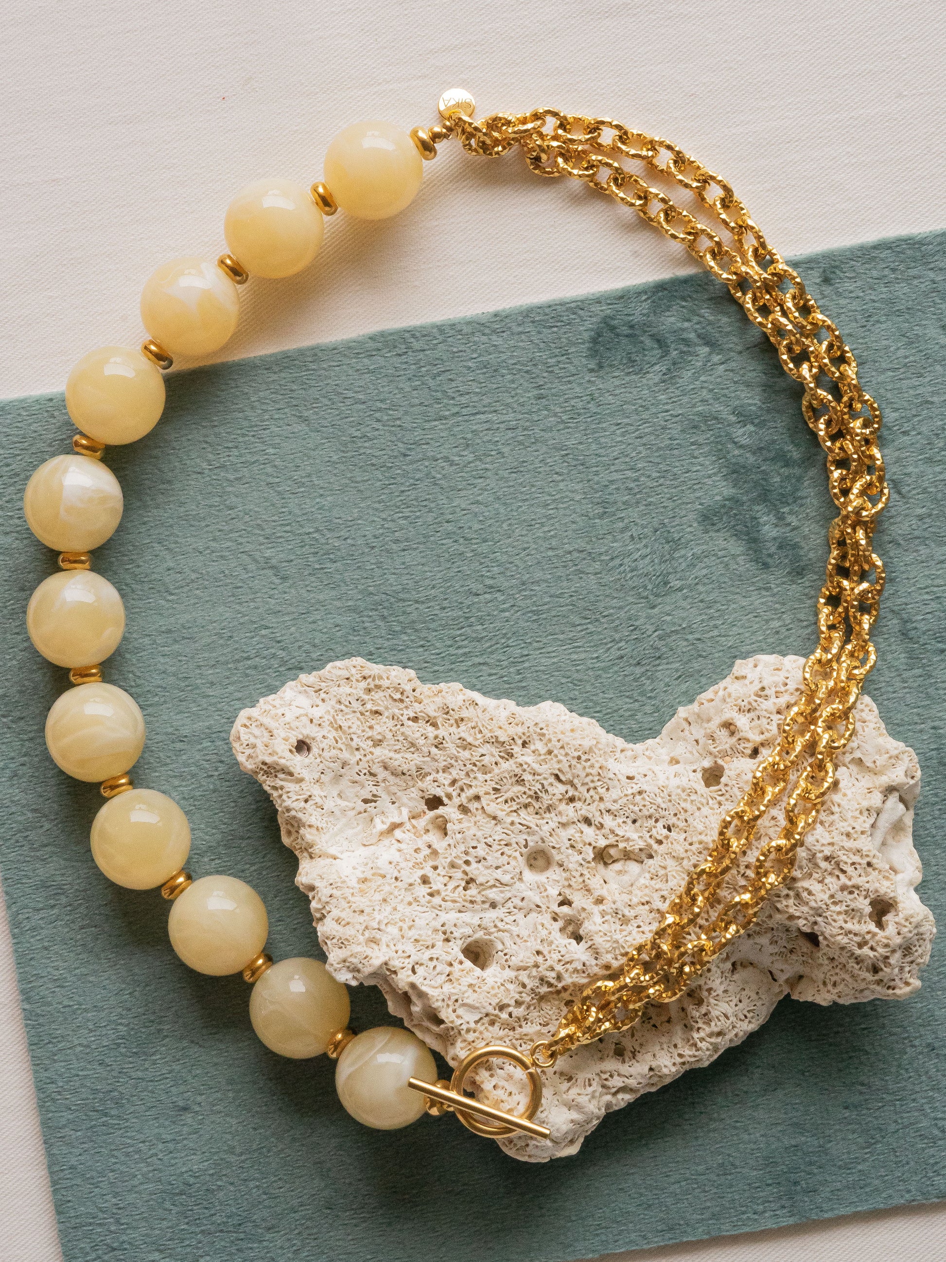 Le collier Billie est fabriqué à la main dans mon atelier. Il est composé d’une double chaine aux maillons striés, de perles dorées, de perles en résine, ainsi que d’un fermoir barre,