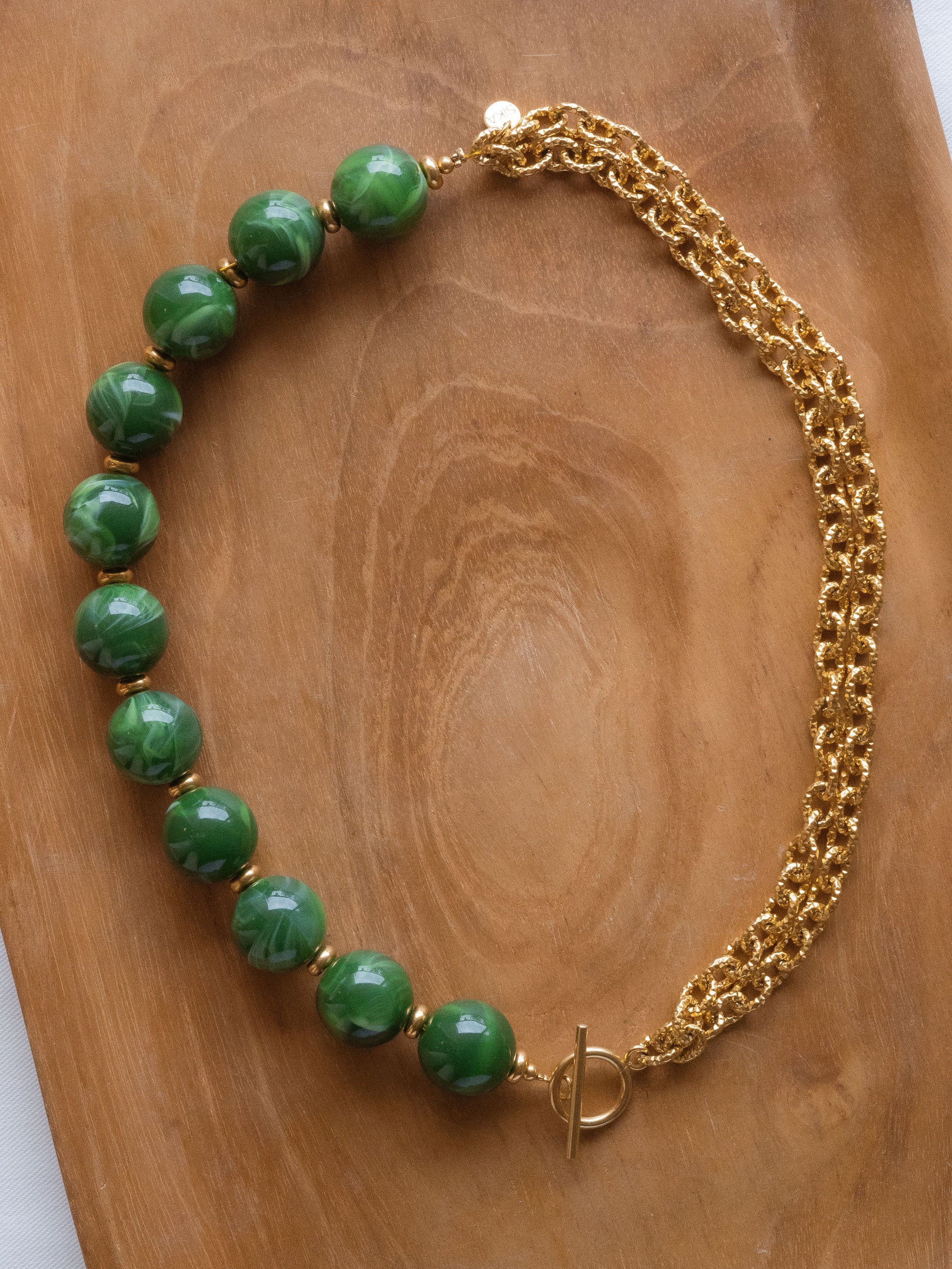 Le collier Billie est fabriqué à la main dans mon atelier. Il est composé d’une double chaine aux maillons striés, de perles dorées, de perles en résine, ainsi que d’un fermoir barre,