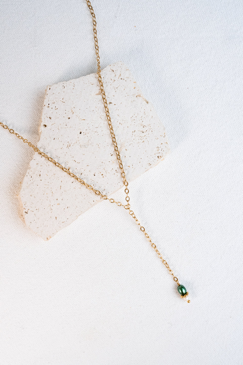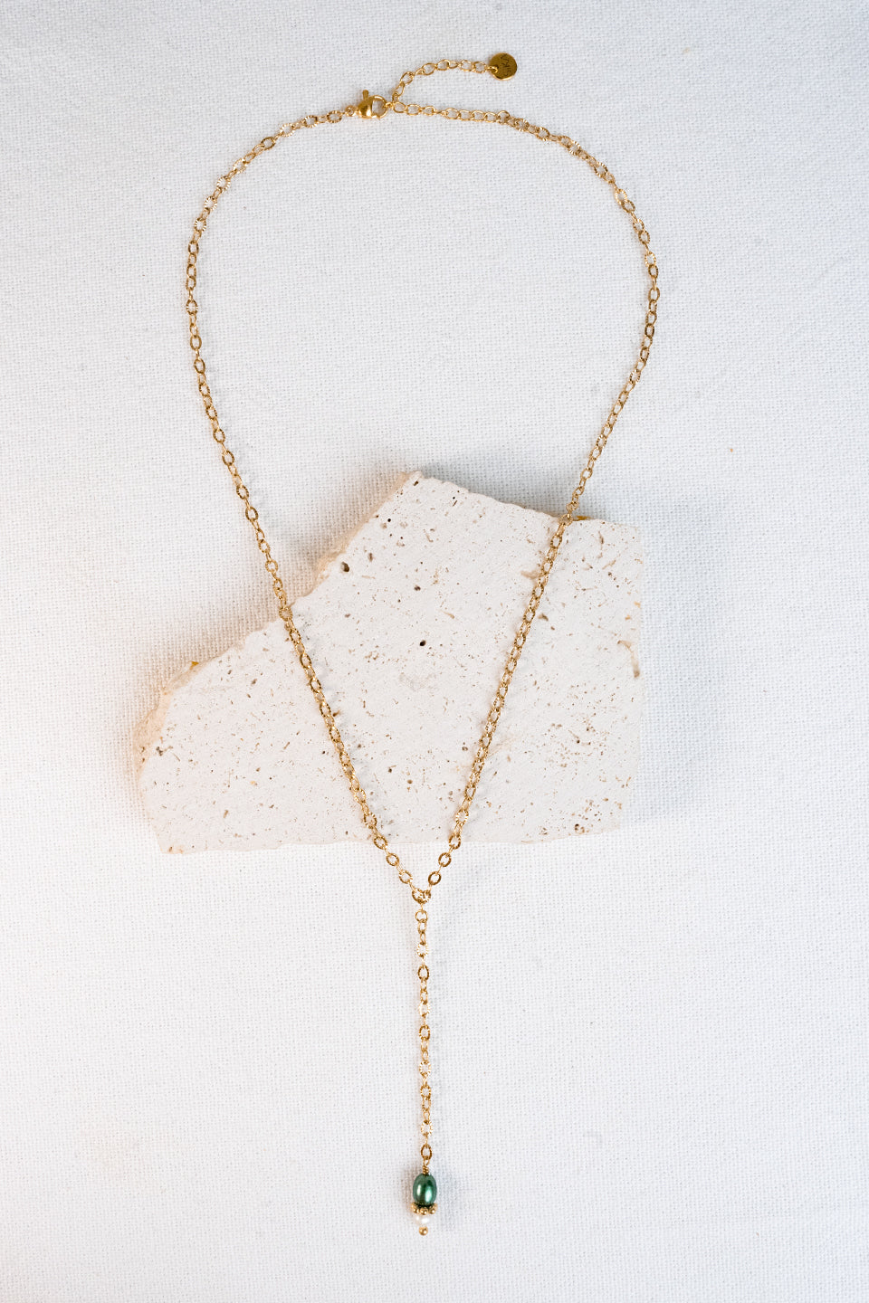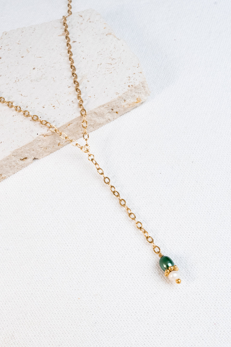 Le collier Calypso est fabriqué à la main dans mon atelier, Il est monté sur une chaine aux maillons striés et orné d’un pendentif décoré de Perles d’eau douce blanche et verte,