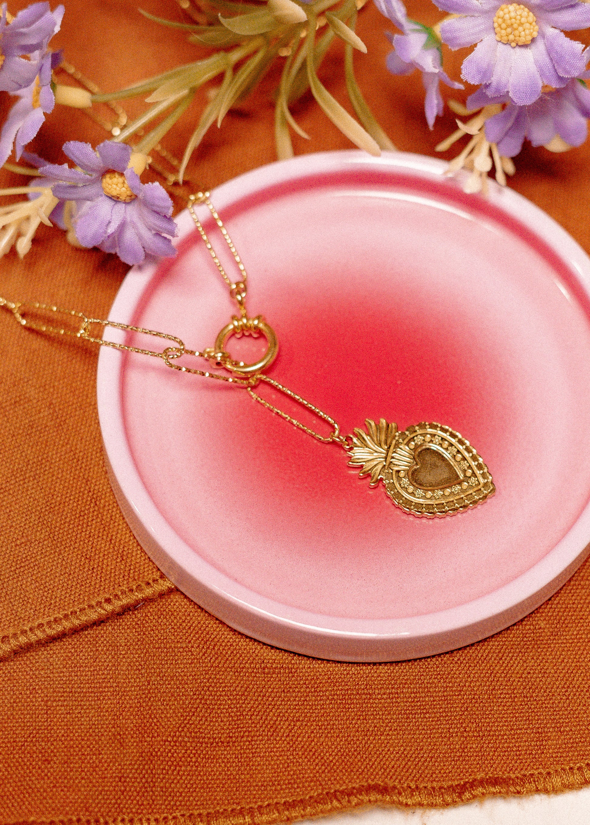Le collier Hope est fabriqué à la main dans mon atelier, Il est monté sur une chaîne aux maillons rectangulaires et striés, Il est orné d'un pendentif doré en forme d'Ex Voto, ainsi que d'un fermoir marin,