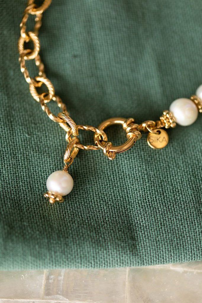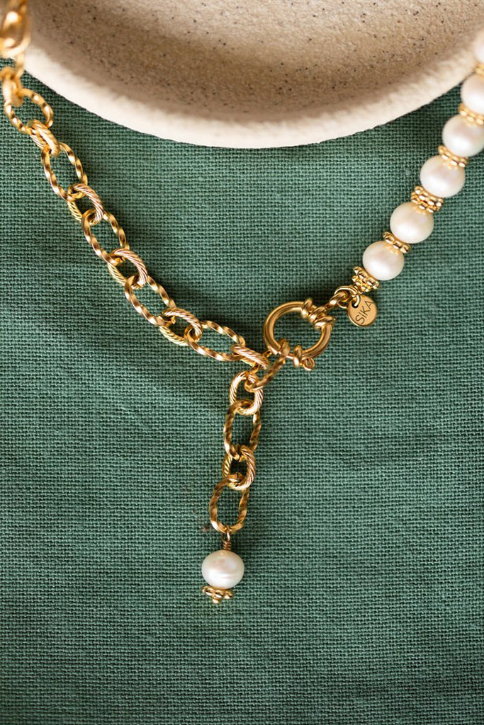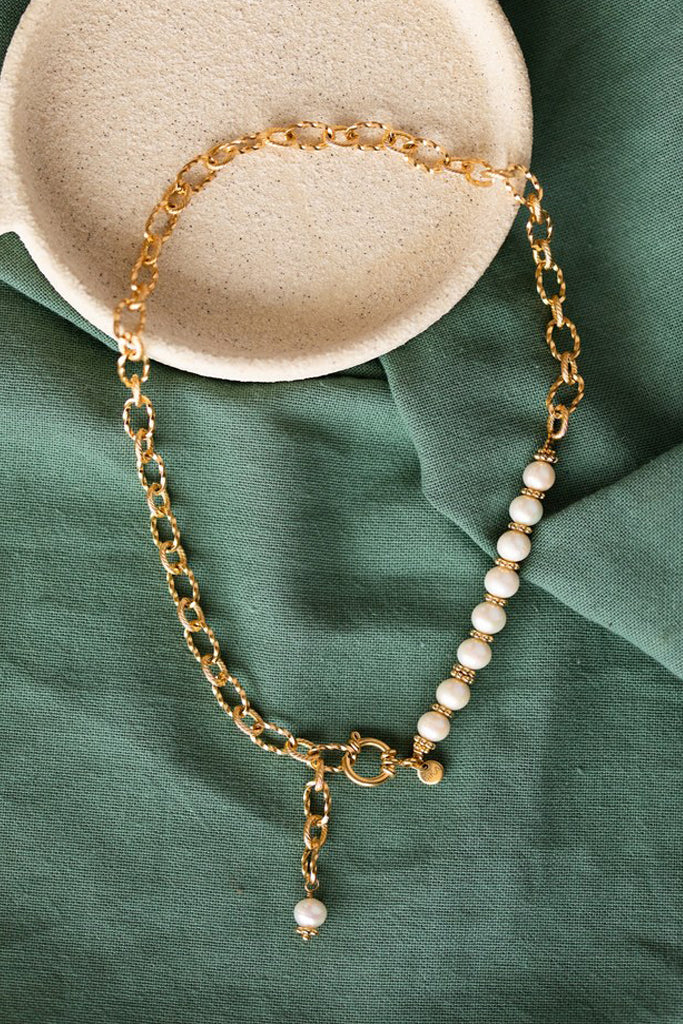 Le collier asymétrique Clémentine est fabriqué à la main dans mon atelier, Il est composé d’une chaîne aux maillons asymétriques et striés, d’un fermoir marin, ainsi que d’une multitude de perles d’eau douce et de perles dorées,