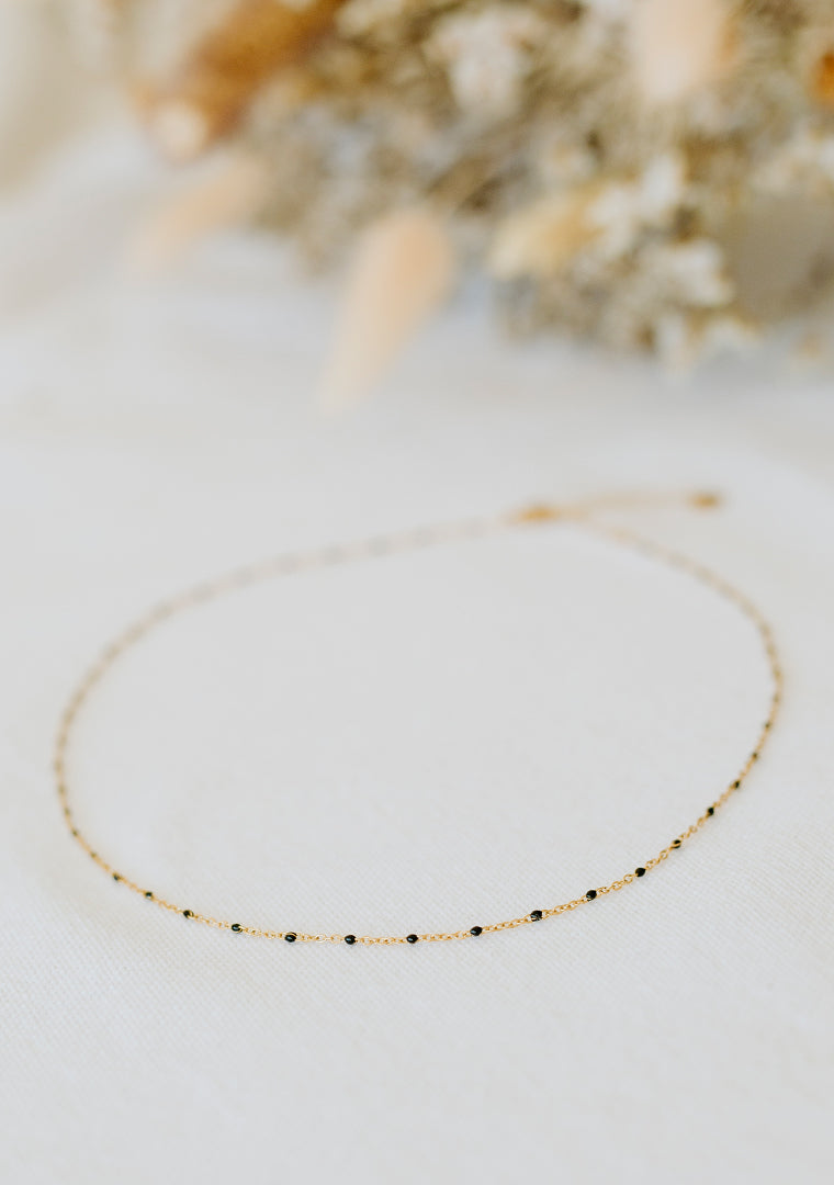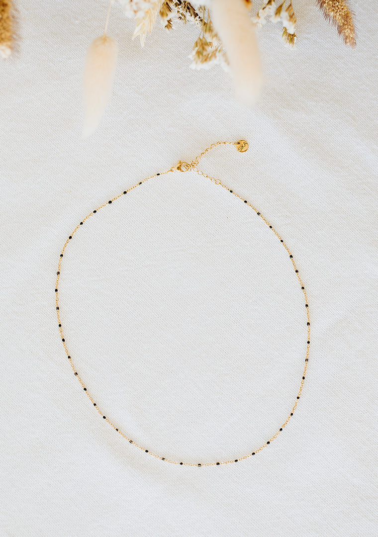 Le collier Erica est fabriqué à la main dans mon atelier, Il est composé d’une fine chaine émaillée en noir,