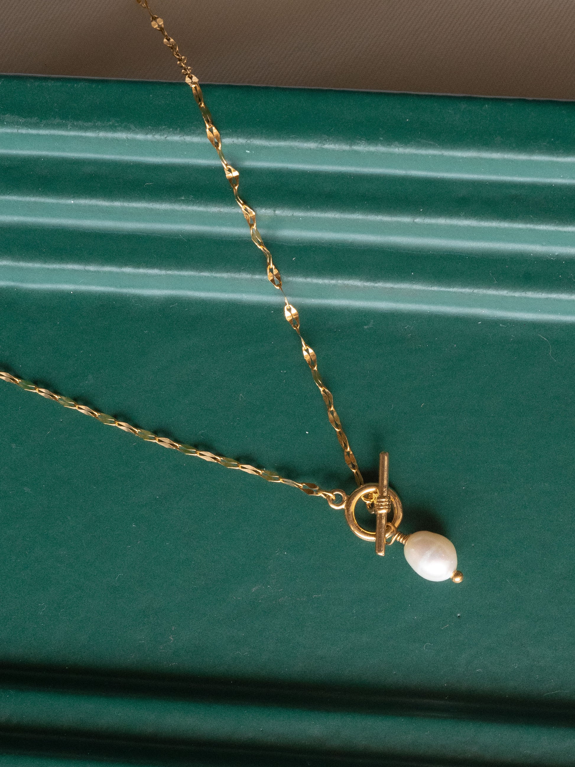 Le collier Gina est fabriqué à la main dans mon atelier. Il est monté sur une chaine et est orné d'un fermoir barre, décoré d'une perle d'eau douce.