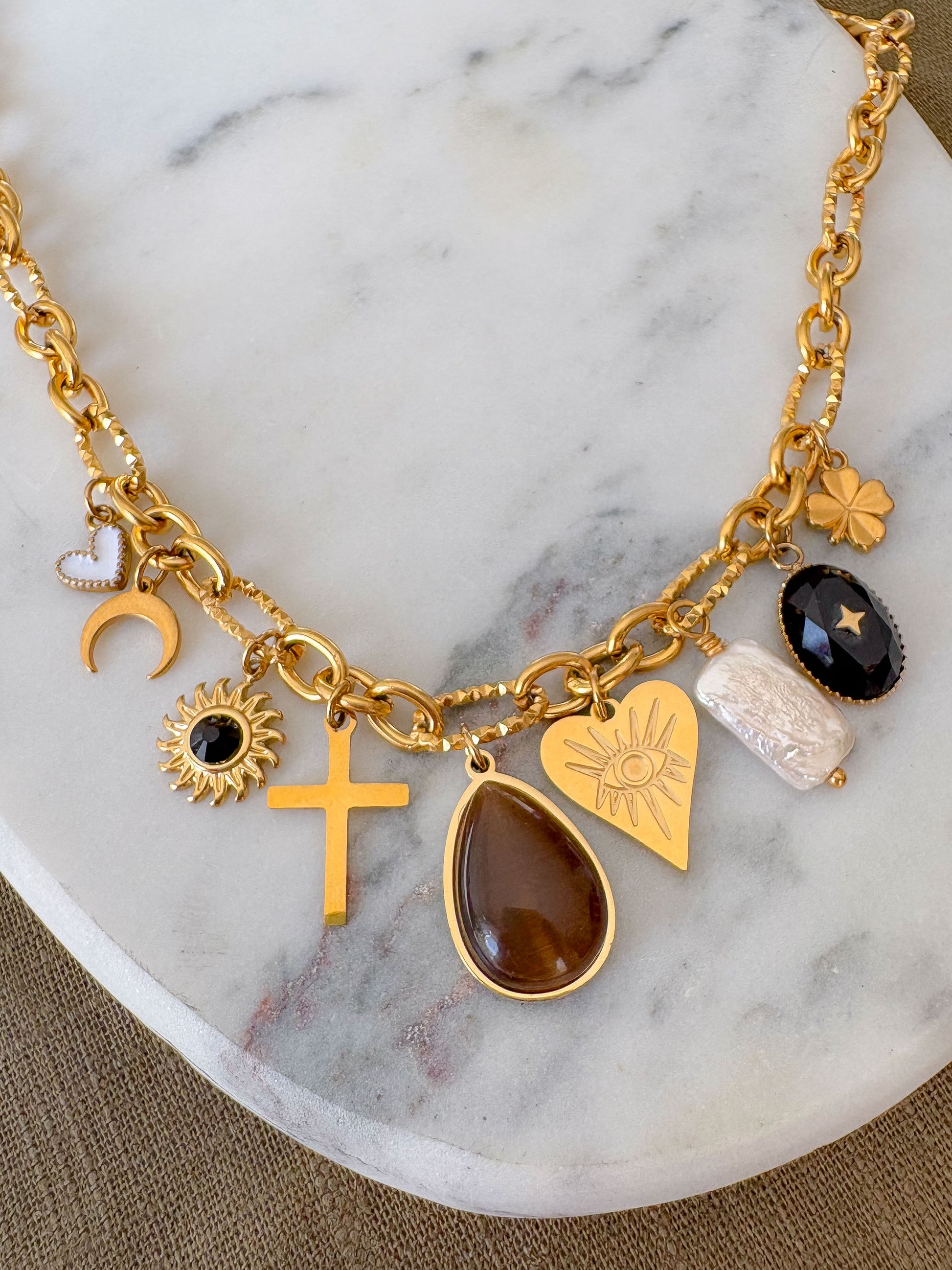 Le collier Hanna est fabriqué à la main dans mon atelier, Il est composé d’une chaine aux maillons asymétriques, décorées d’une multitude de pampilles dorées et en pierre semi-précieuses.