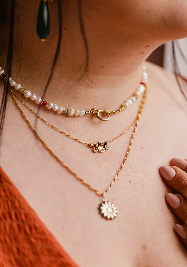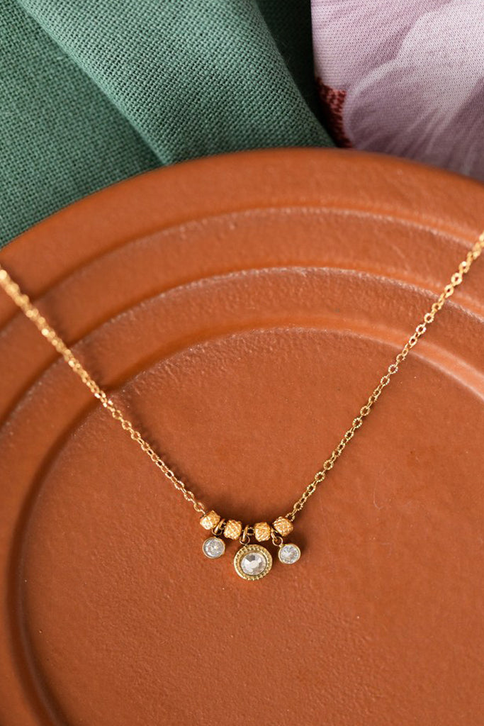 Le collier Hélios est fabriqué à la main dans mon atelier, Il est monté sur une fine chaîne aux maillons ovales et striés et décoré de perles dorées et striées ainsi que de pampilles incrustées de strass,