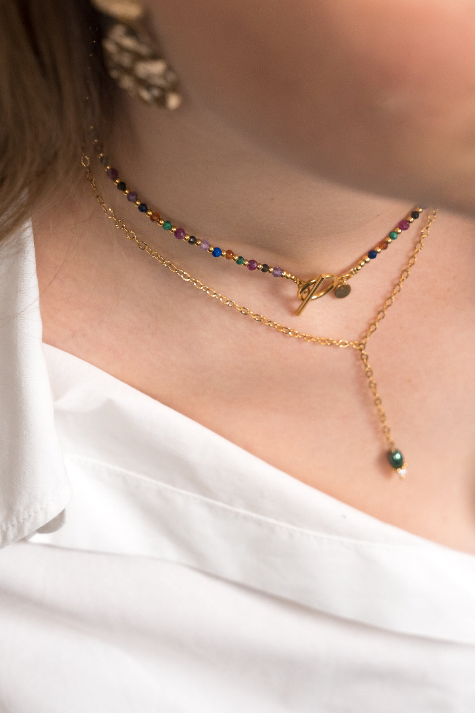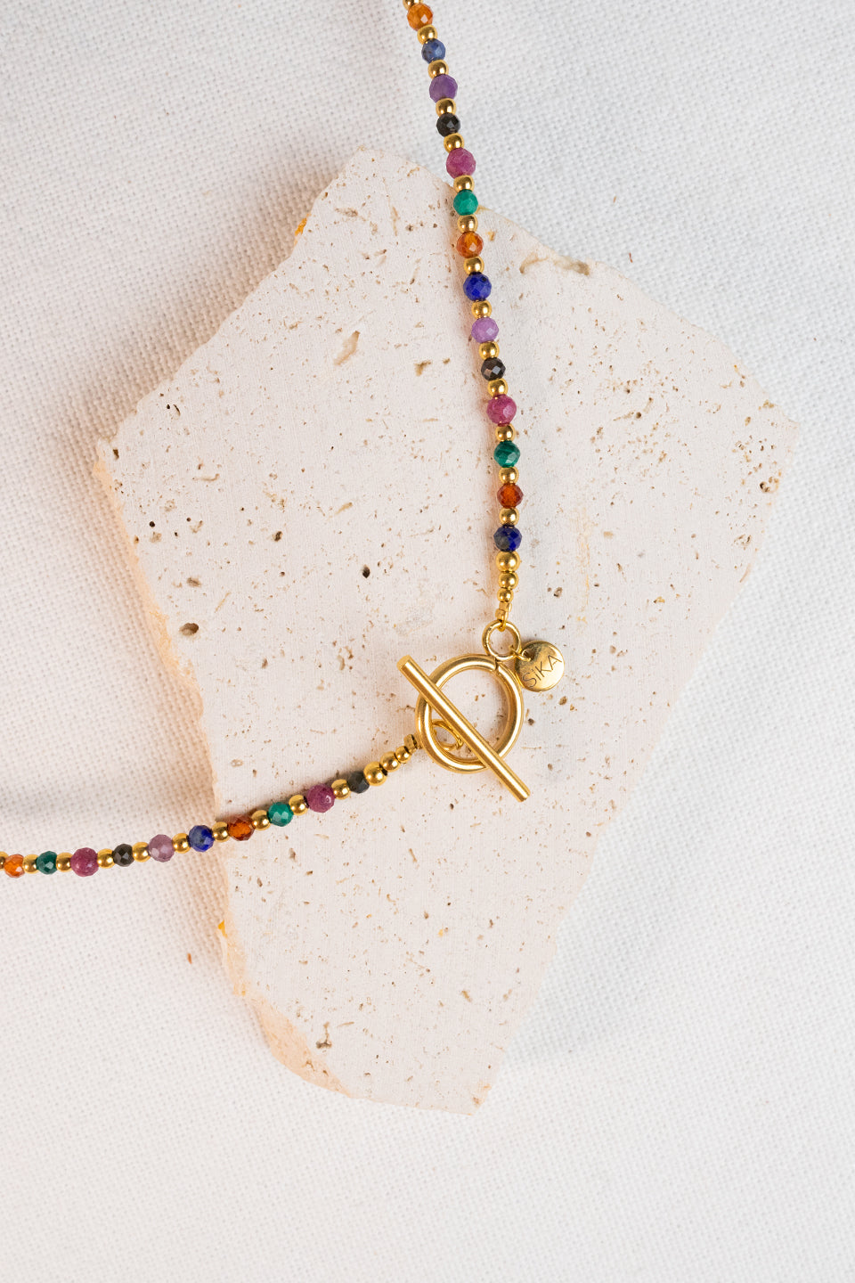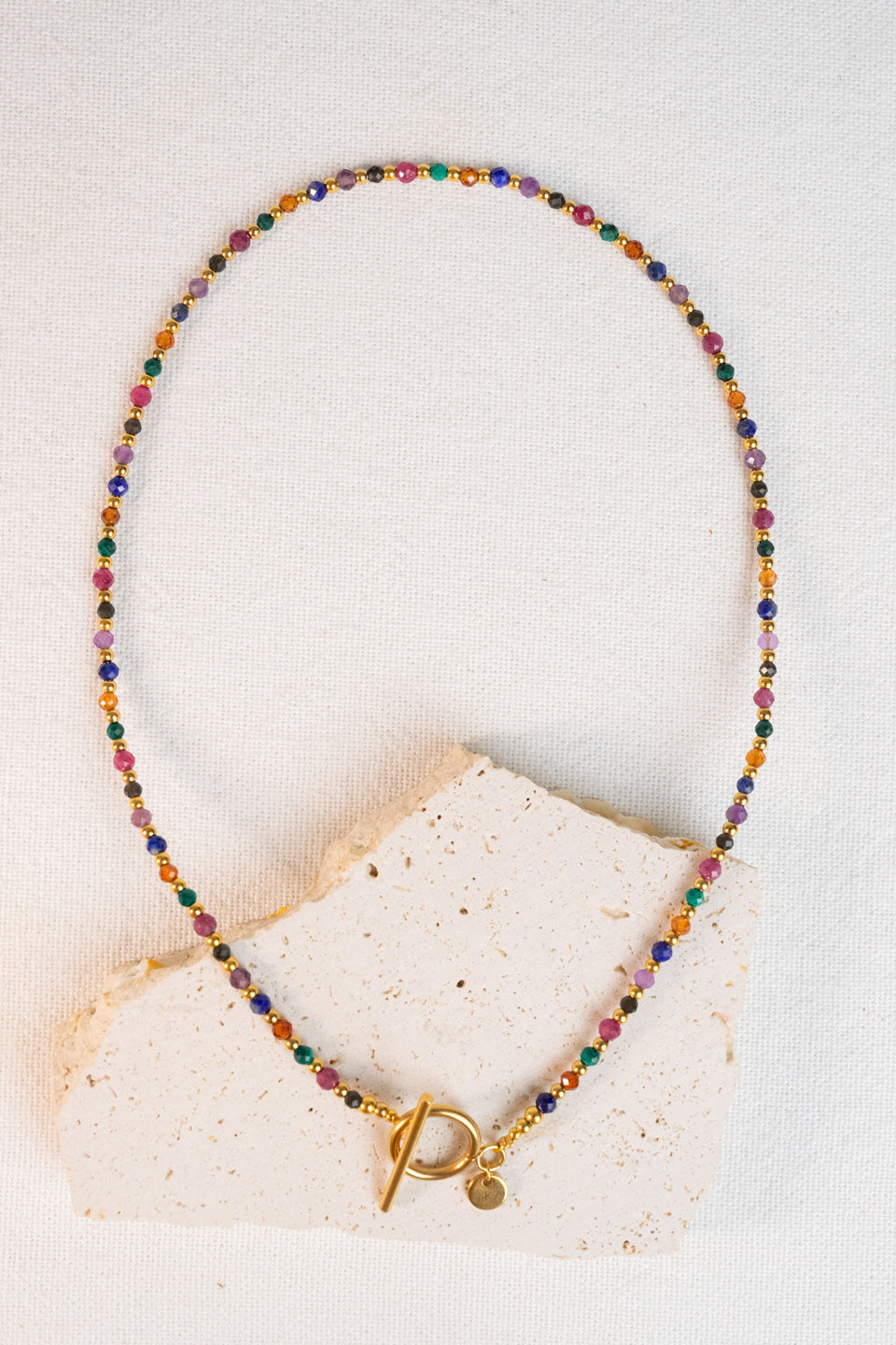 Le collier Indira est fabriquée à la main dans mon atelier, Il est composé de diverses pierres semi-précieuses, de perles dorées et d’un fermoir bâton,