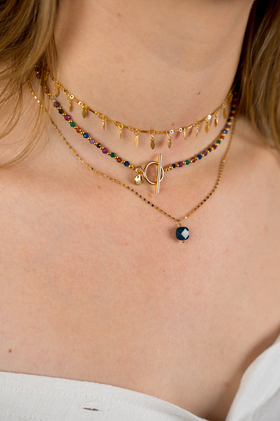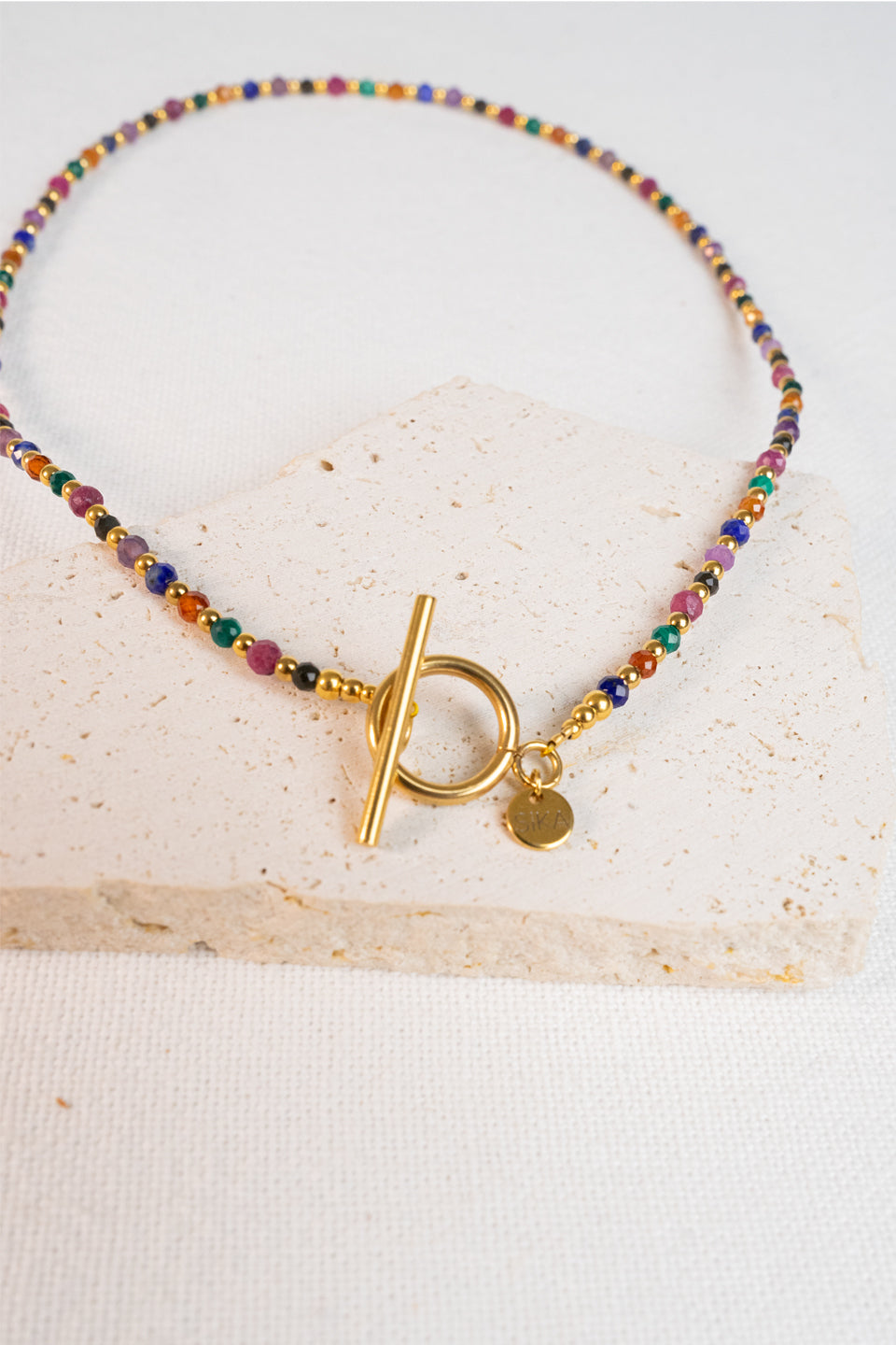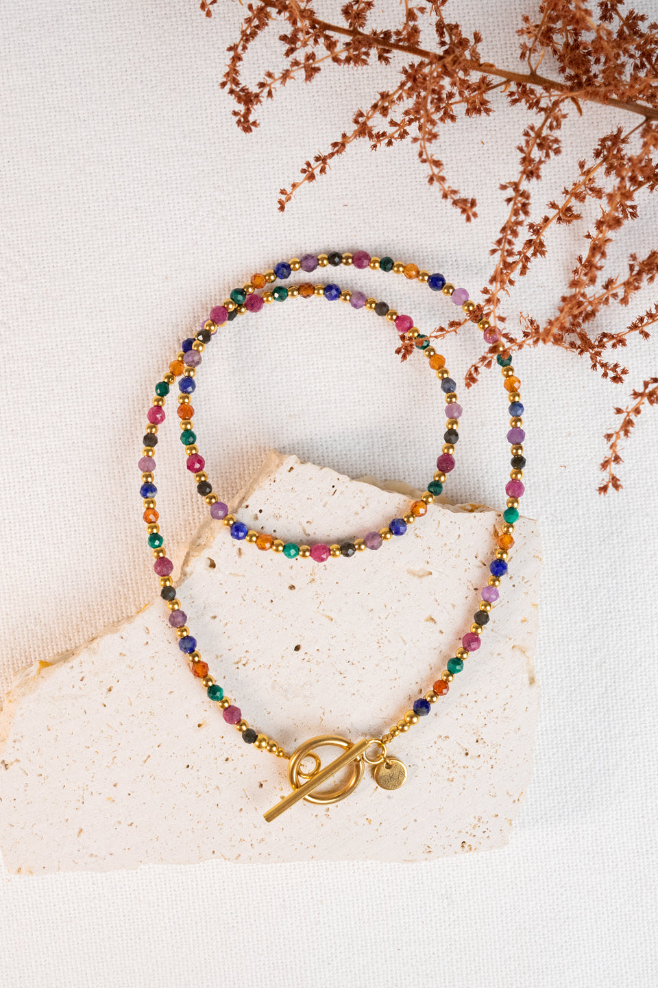 Le collier Indira est fabriquée à la main dans mon atelier, Il est composé de diverses pierres semi-précieuses, de perles dorées et d’un fermoir bâton,