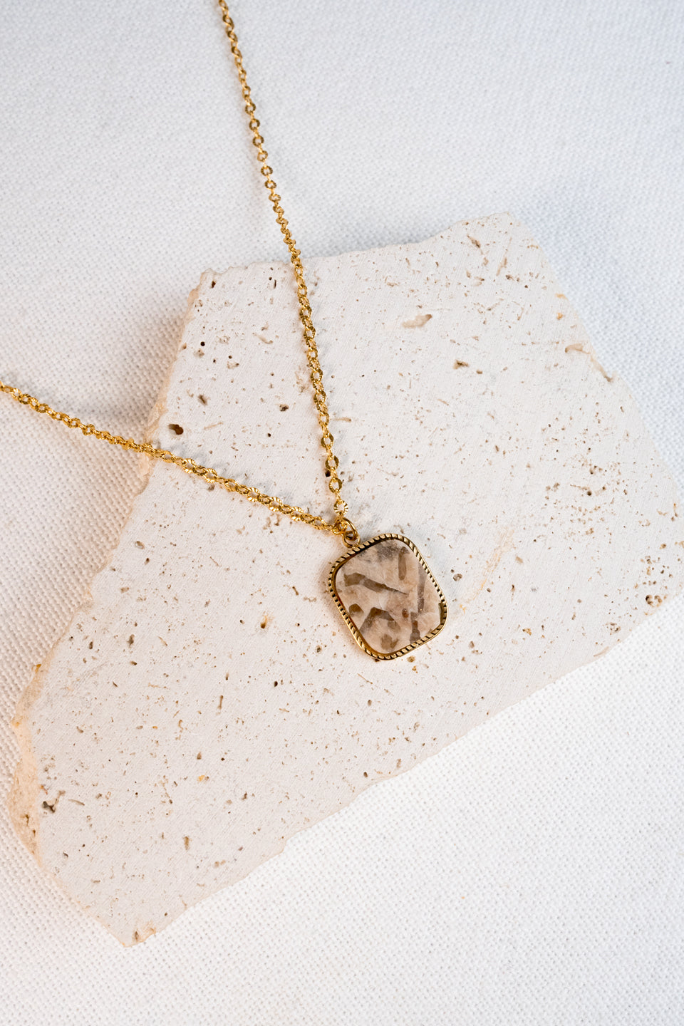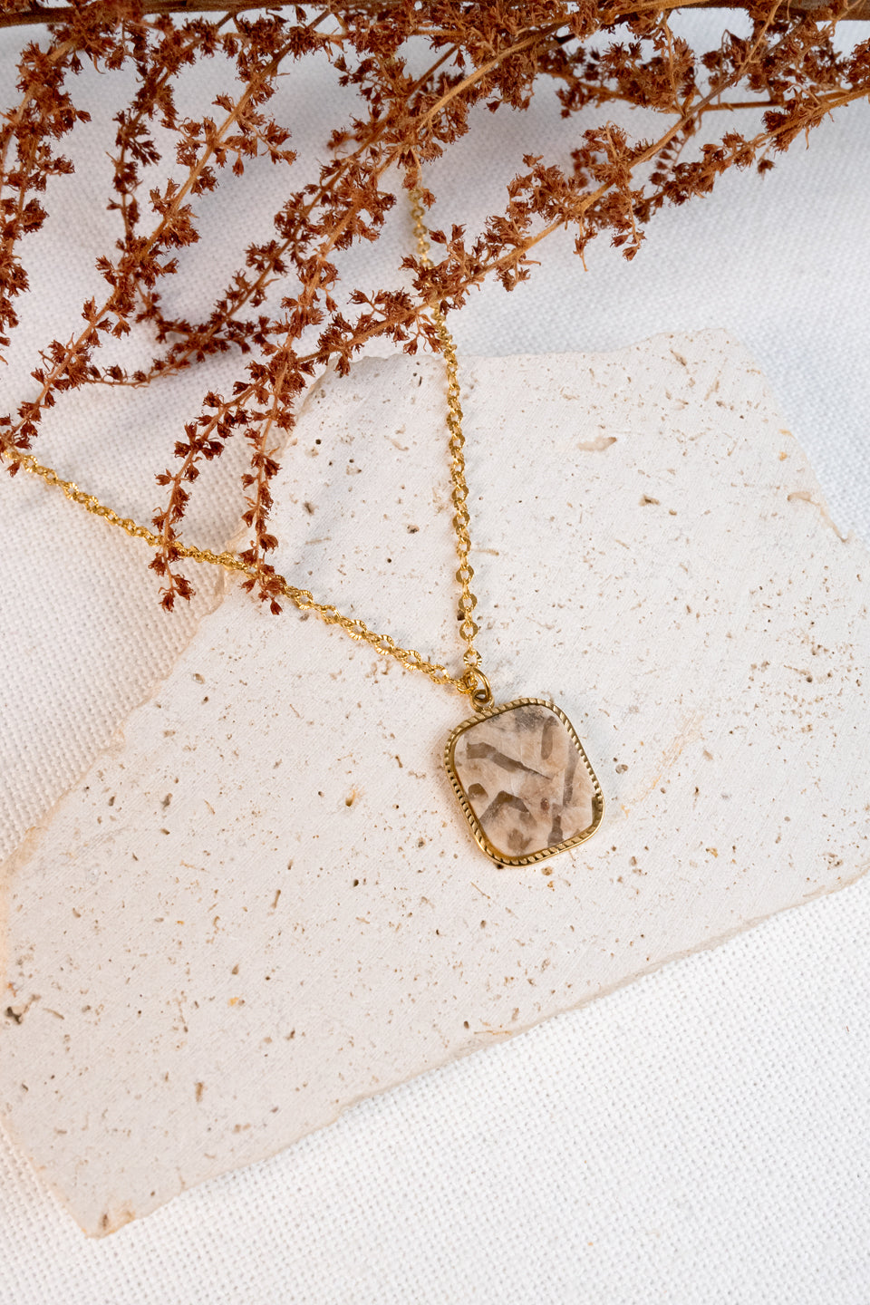 Le collier Louise est fabriqué à la main dans mon atelier, Il est monté sur une chaine aux maillons striés et orné d’un pendentif serti d’une Rhodochrosite,