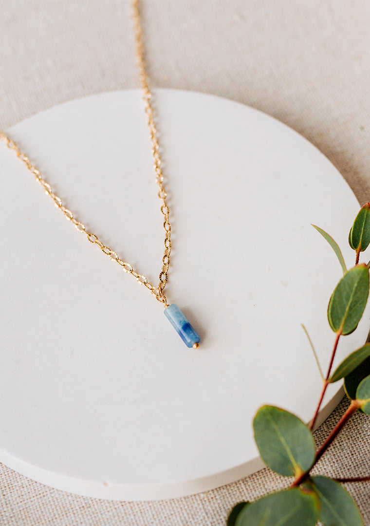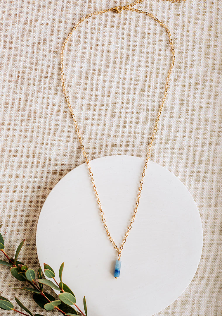 Le collier Isa est fabriqué à la main dans mon atelier, Il est monté sur une chaine aux maillons ovales striés et décoré d’un pendentif en Lépidolite bleue,