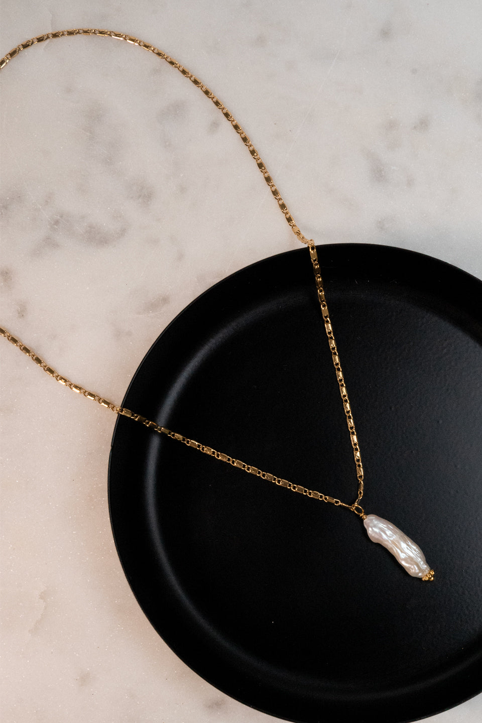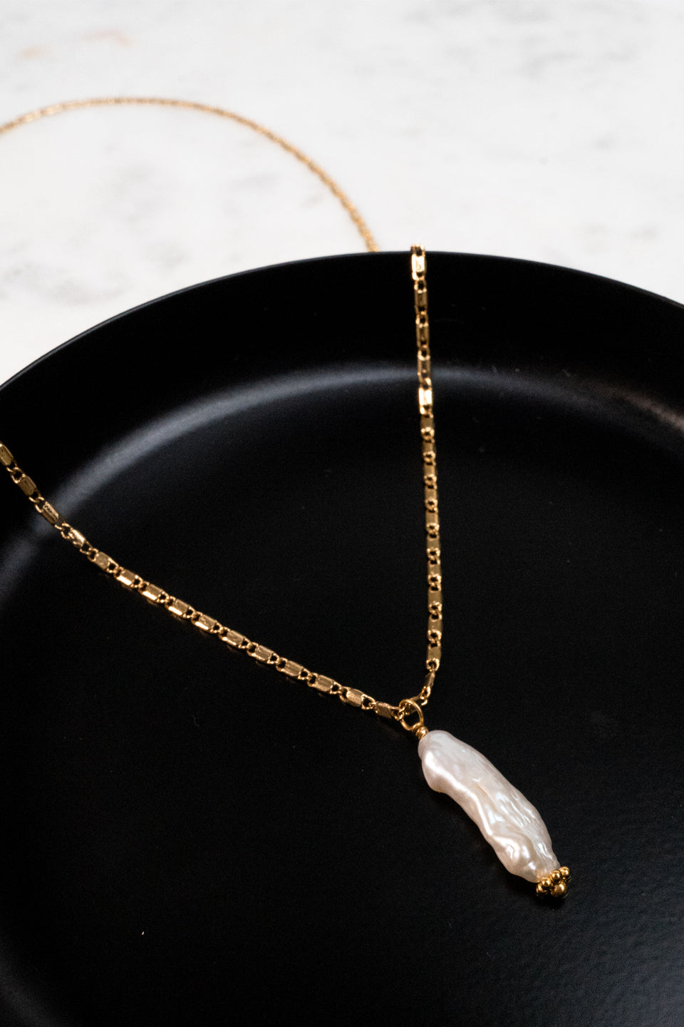 Le collier Laïa est fabriqué à la main dans mon atelier, Il est monté sur une chaine aux mailles plates et orné d’un pendentif en perle d’eau douce blanche et rectangulaire,