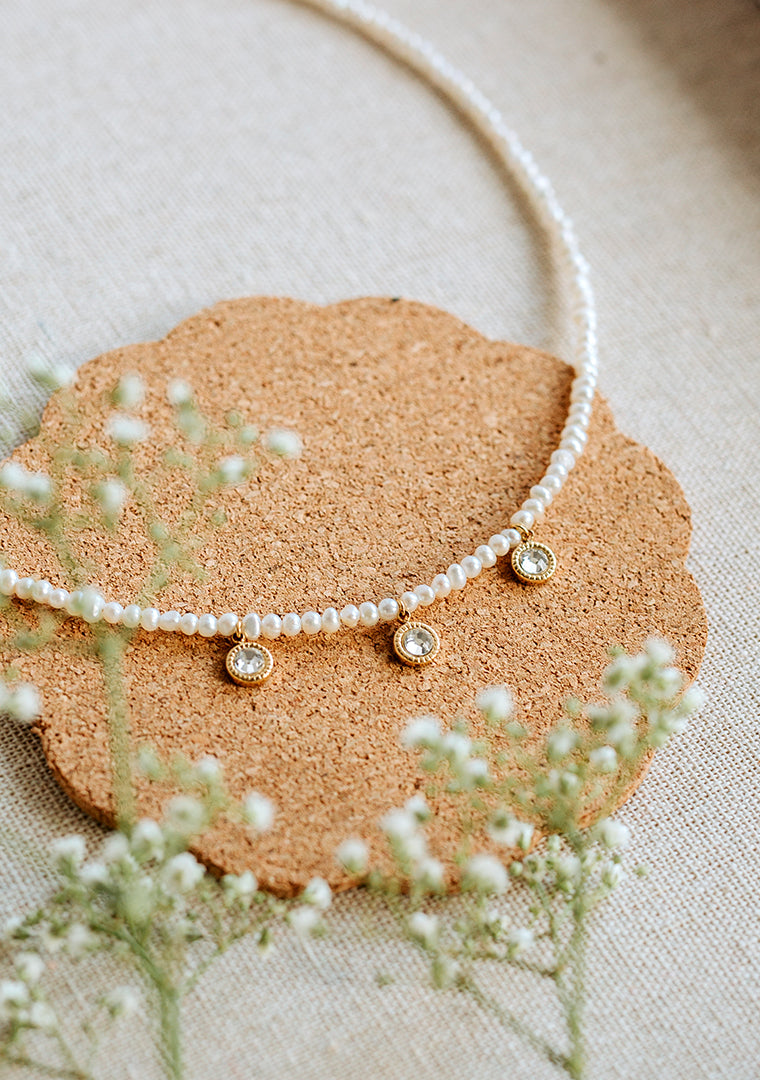 Le collier Léa est fabriqué à la main dans mon atelier, Il est composé de Perles d’eau douce et de quelques pampilles serties de strass,