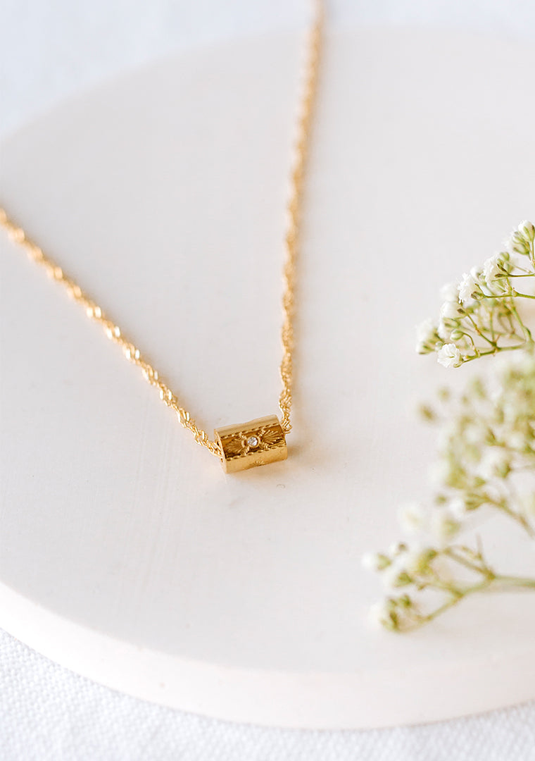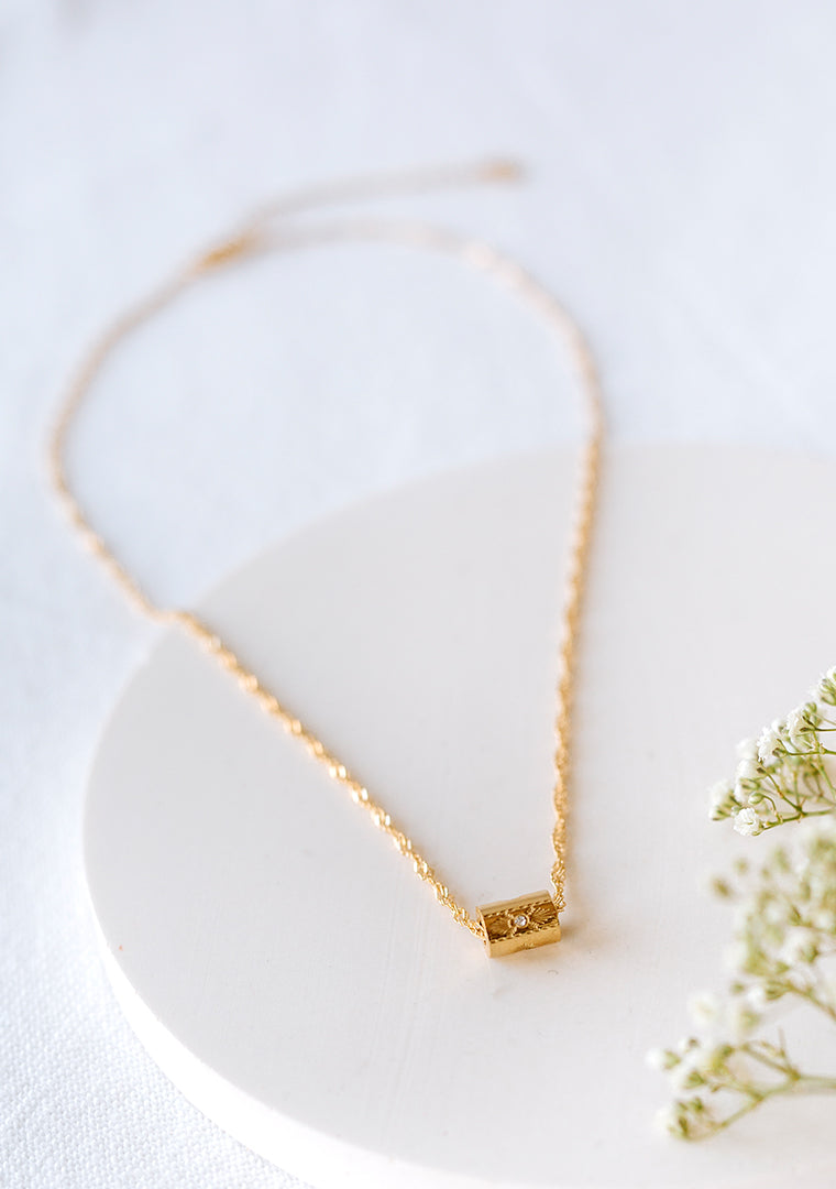 Le collier Lexi est fabriqué à la main dans mon atelier, Il est monté sur une chaine torsadée décorée d’une perle tubée gravée et sertie de zircons,