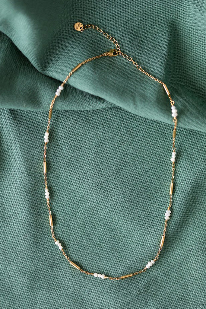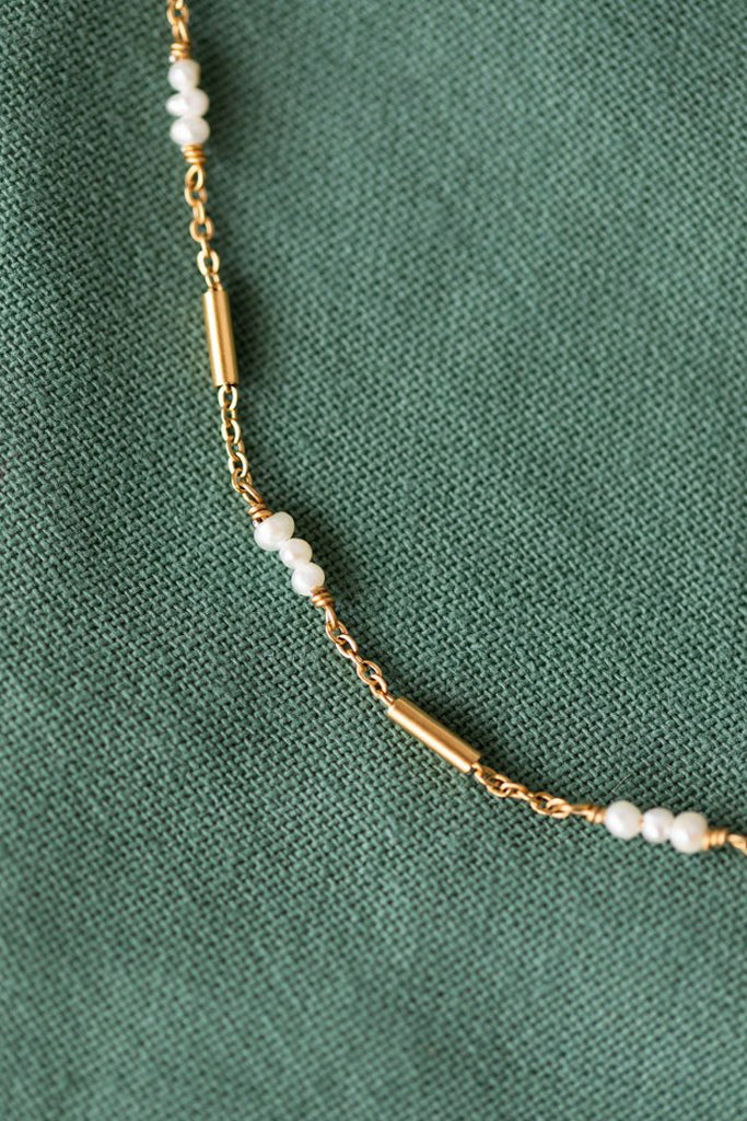 Le collier Lila est fabriqué à la main dans mon atelier, Il est composé d’une chaîne fine décorée de perles d’eau douce en alternance avec des tubes dorés,
