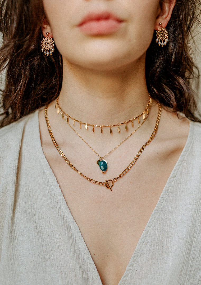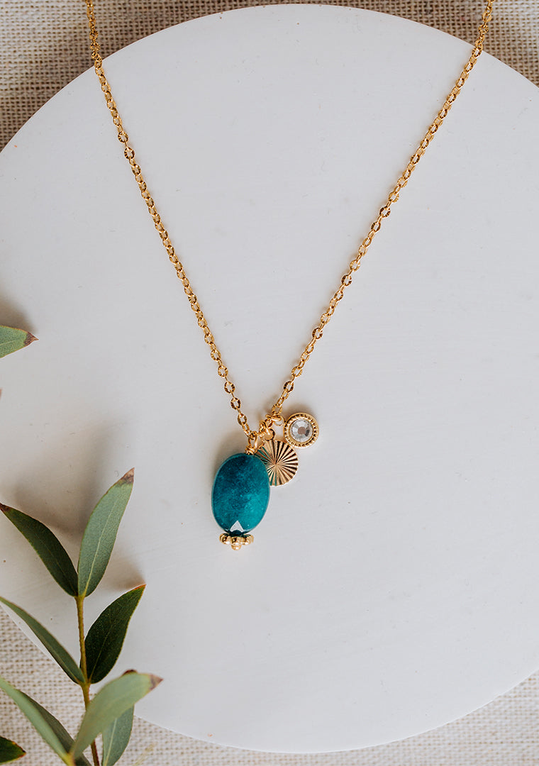 Le collier Lina est fabriqué à la main dans mon atelier, Il est monté sur une chaine aux maillons ovales striés et décoré d’une Jade teintée, d’une médaille striée et d’un strass,