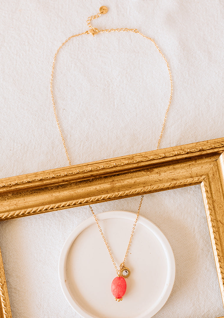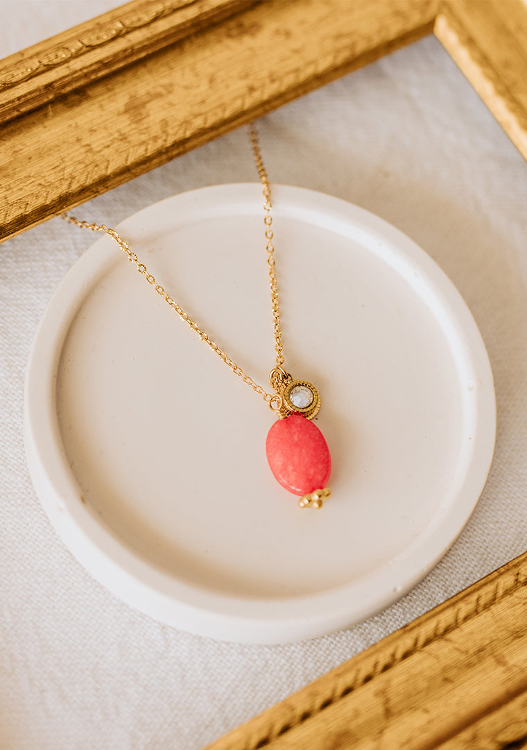 Le collier Lina est fabriqué à la main dans mon atelier, Il est monté sur une chaine aux maillons ovales striés et décoré d’une Jade teintée rose, d’une médaille striée et d’un strass,