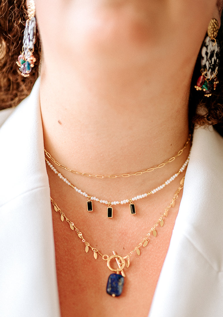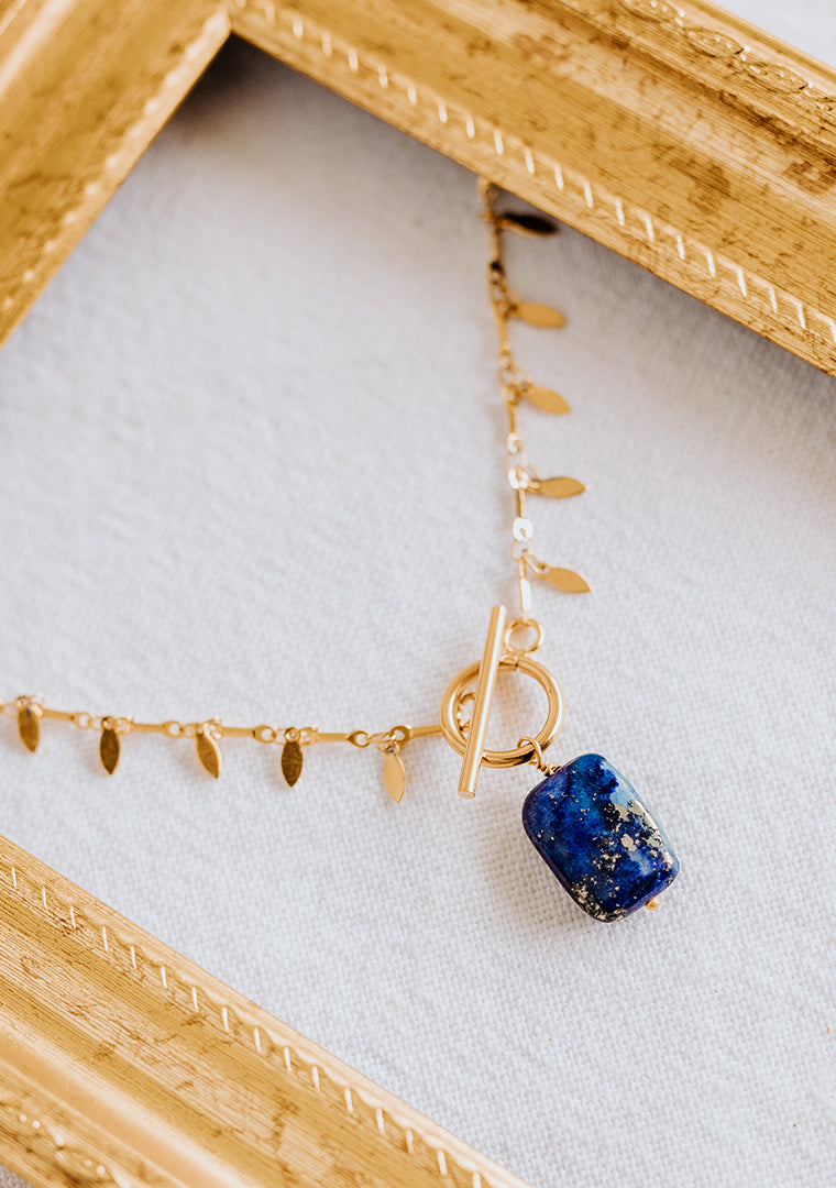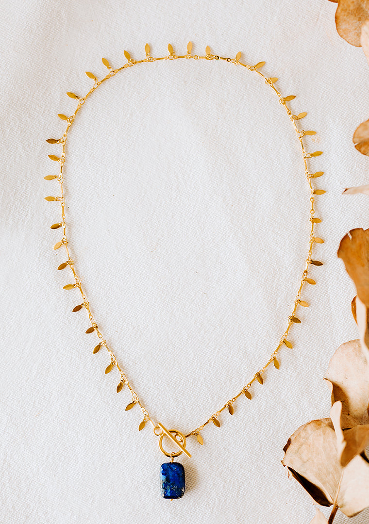 Le collier Lou est fabriqué à la main dans mon atelier, Il est monté sur une chaîne décorée de petites médailles en forme de goutte, d’un fermoir bâton et d’un pendentif en Lapis-Lazuli,