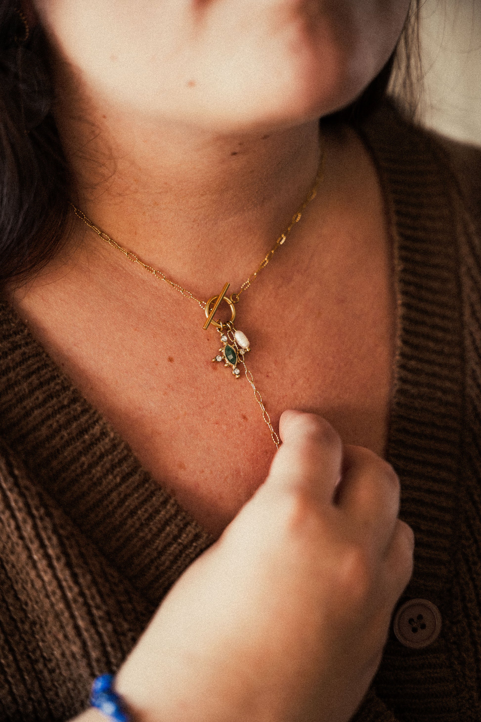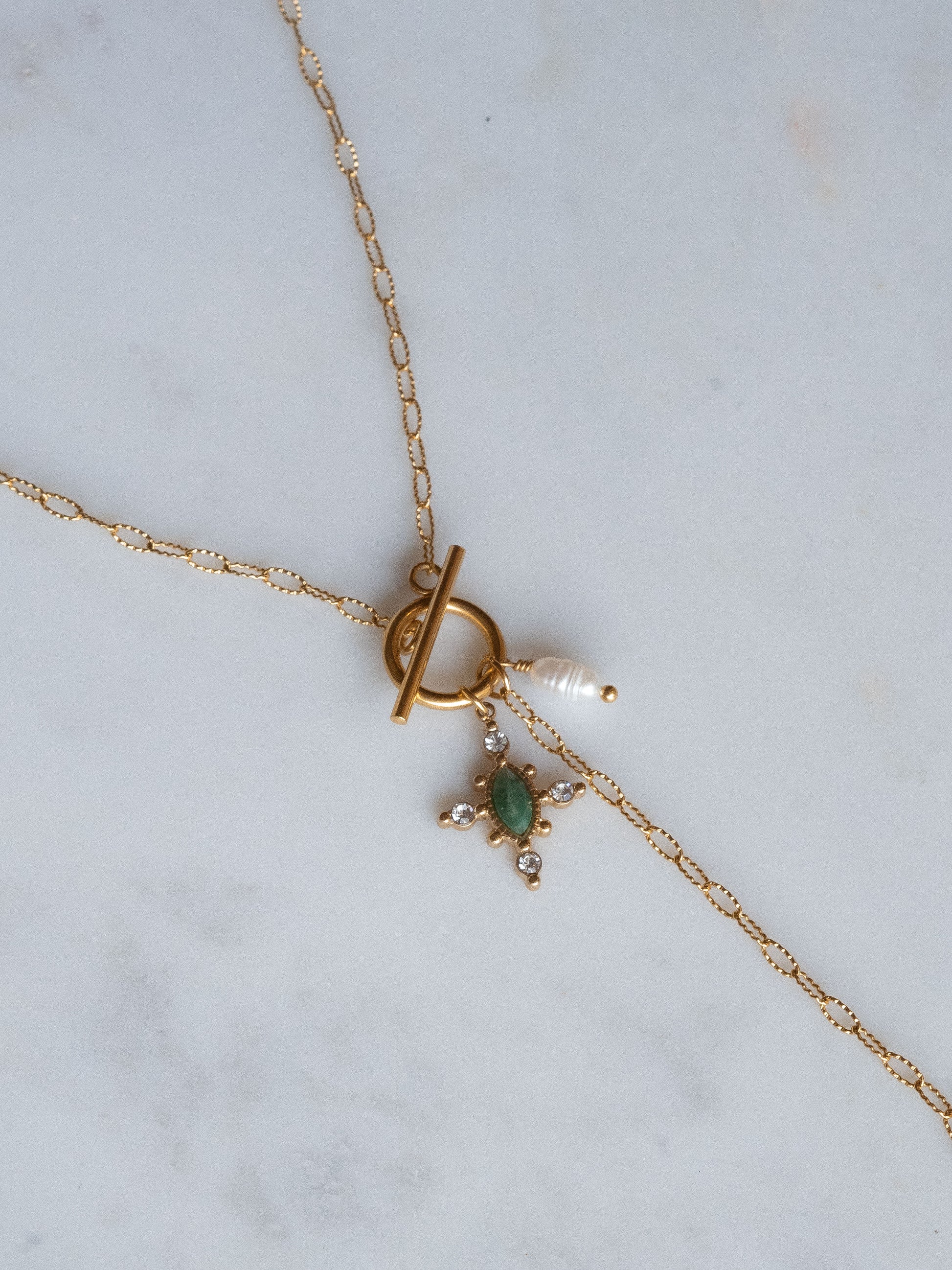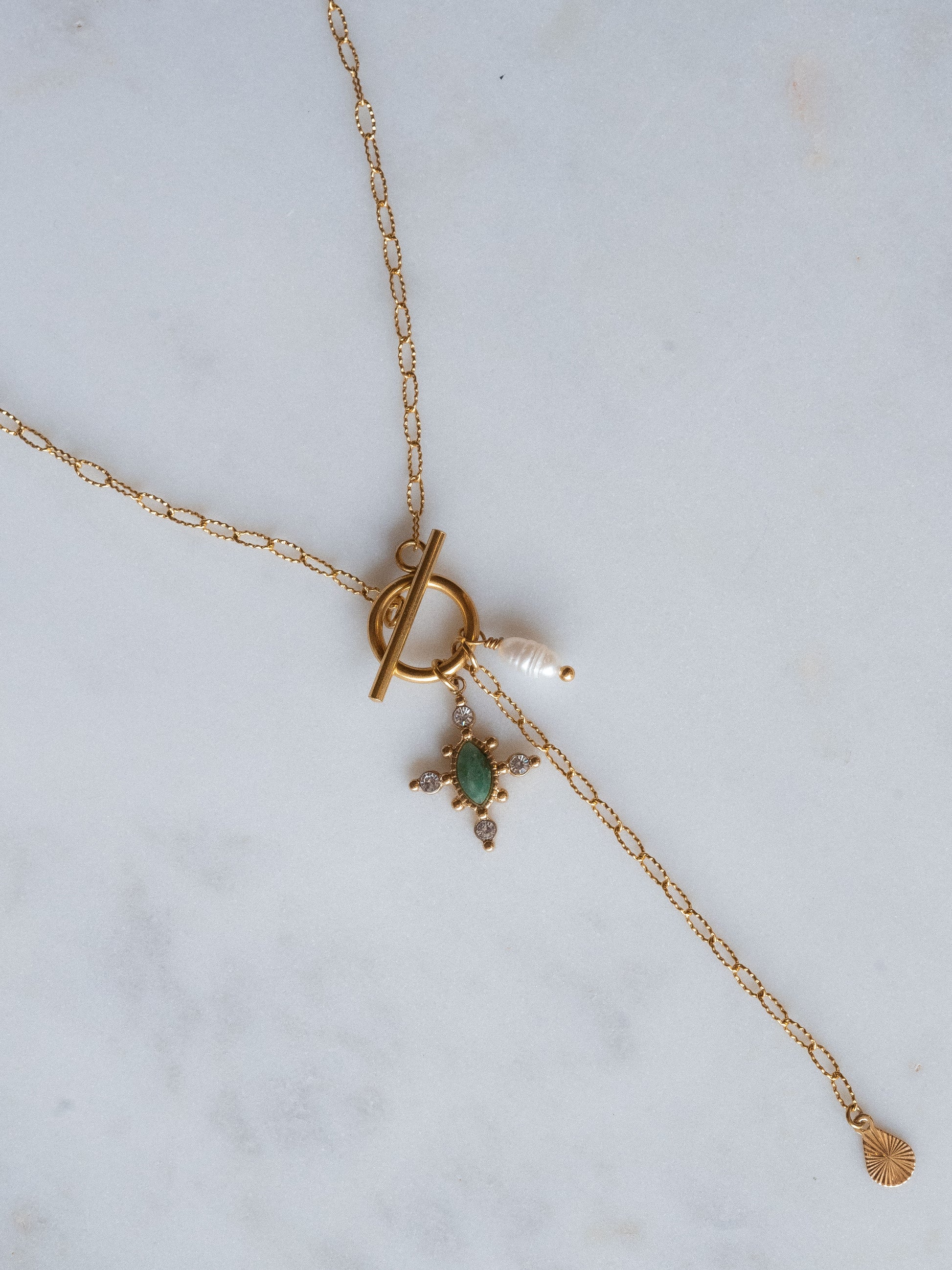 Le collier Mahaut est fabriqué à la main dans mon atelier. Il est monté sur une chaine aux maillons rectangulaires et striés, habillée d’un fermoir bâton décoré de pampilles composées d’une Perle d’eau douce, d'un pendentif orné de strass et d'un cabochon en Agate verte. Le collier est également orné d’une chaine pendante habillée d’une médaille striée en forme de goutte,