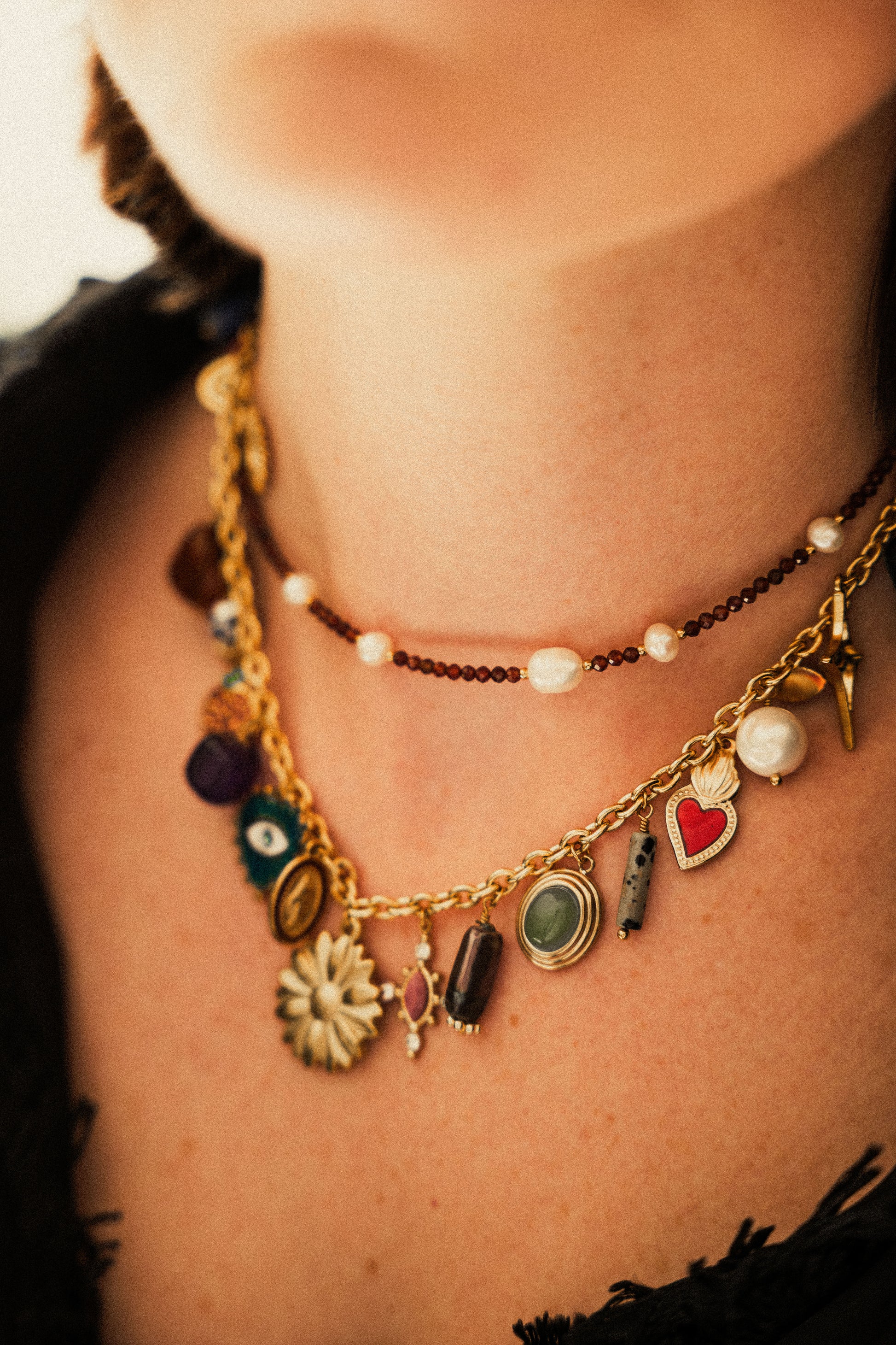 Le collier Marceau est fabriqué à la main dans mon atelier. Il est composé d’une chaine forçat et d'une multitude de pampilles dorées, émaillées, en pierres semi précieuses, et porcelaine.