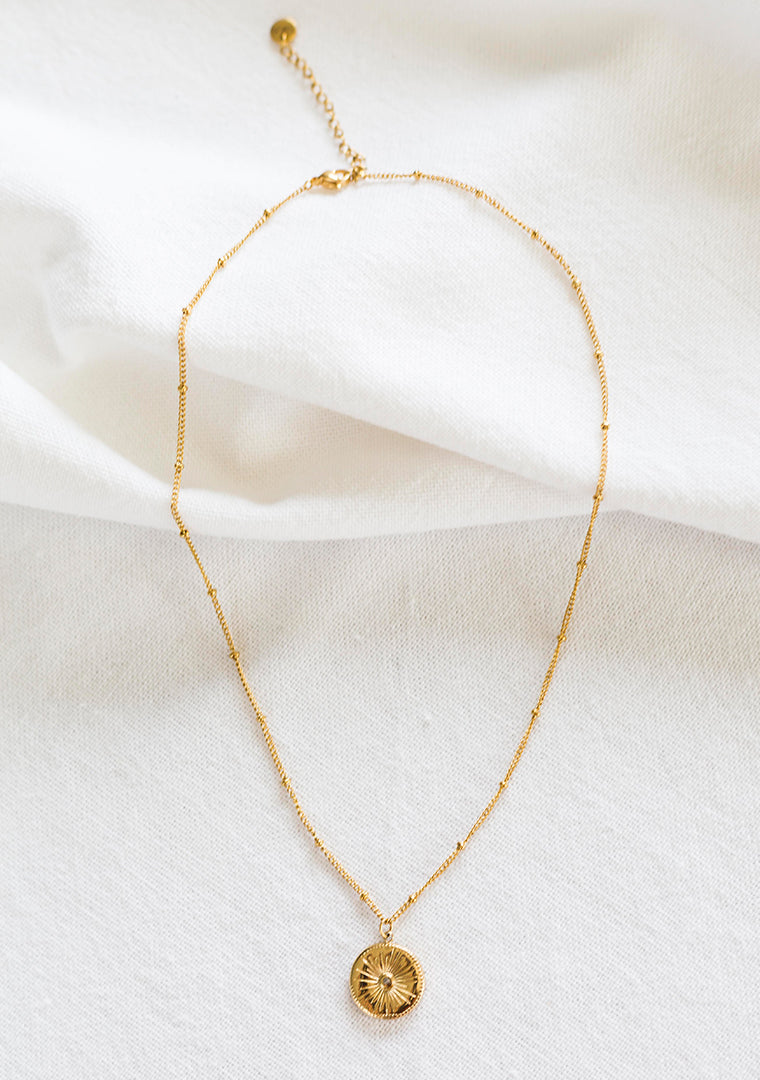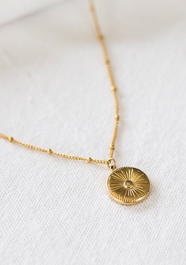 Le collier Maria est fabriqué à la main dans mon atelier, Il est monté sur une fine chaine aux mailles décorées de billes et habillée d’une médaille incrustée d’un Zircon,