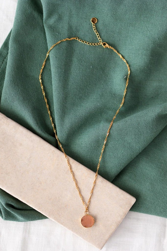 Le collier Marjolaine est fabriqué à la main dans mon atelier, Il est monté sur une chaîne torsadée, ornée d’un médaillon doré serti d’une pierre de soleil,