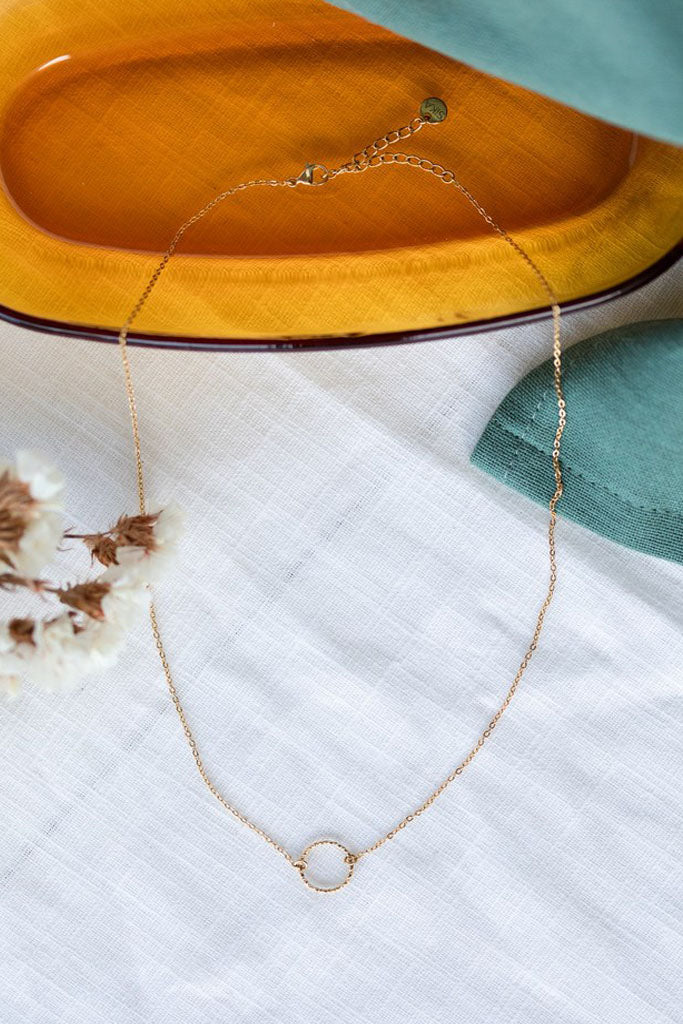 Le collier Nad est fabriqué à la main dans mon atelier, Il est monté sur une fine chaîne aux maillons ovales et striés et orné d’un pendentif circulaire,
