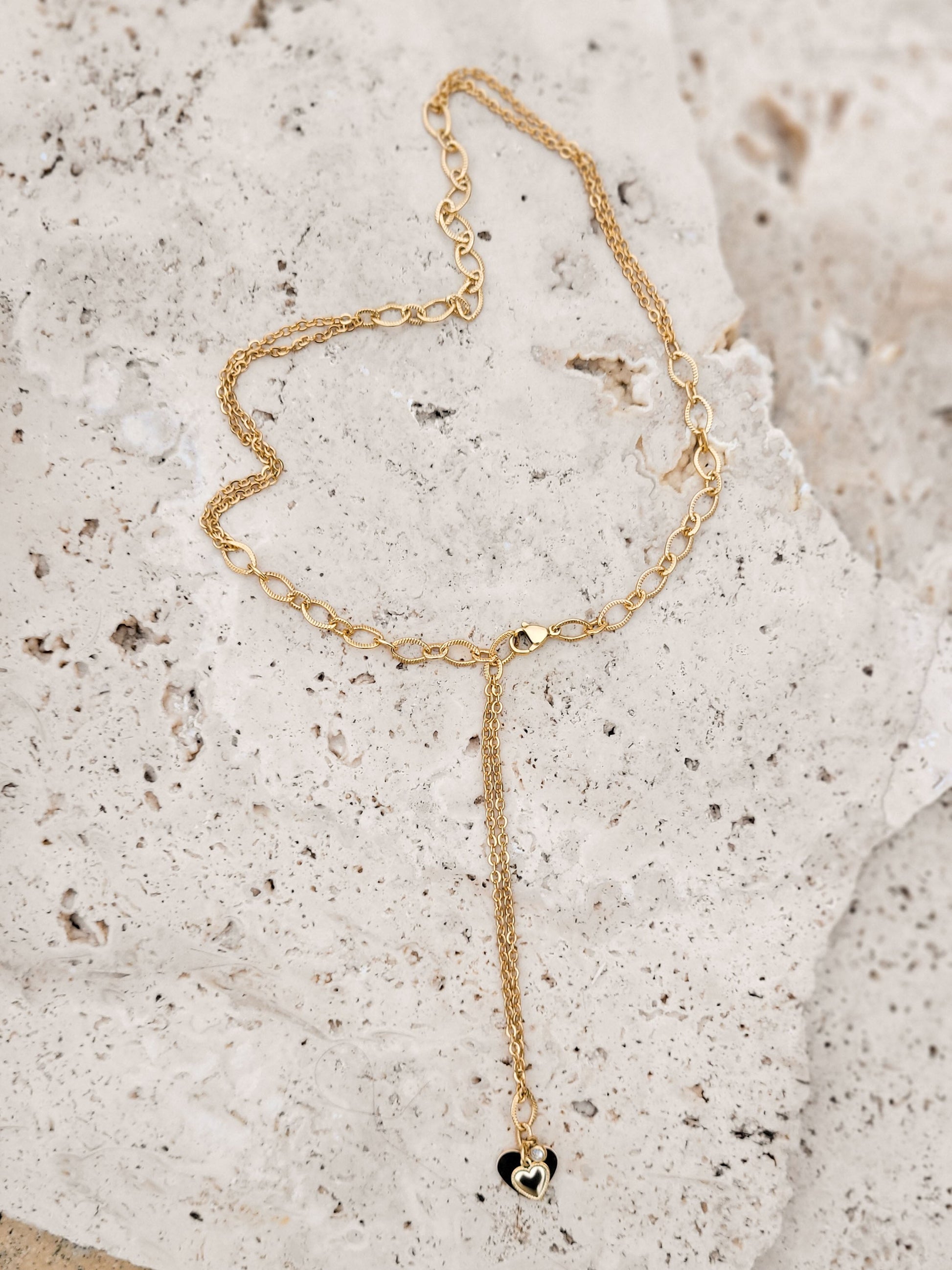 Le collier Naya est fabriqué à la main dans mon atelier, Il est composé d’une chaines asymétrique et est orné d’un pendentif composé de deux médailles en forme de coeur et d’un strass,