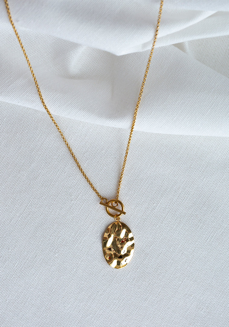 Le collier long Oro est fabriqué à la main dans mon atelier, Il est monté sur une fine chaine à maillons ronds, décorée d’un fermoir barre et d’une médaille martelée ovale,