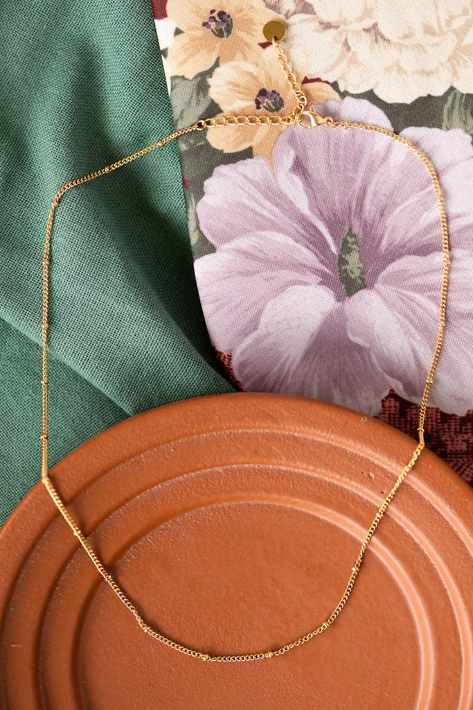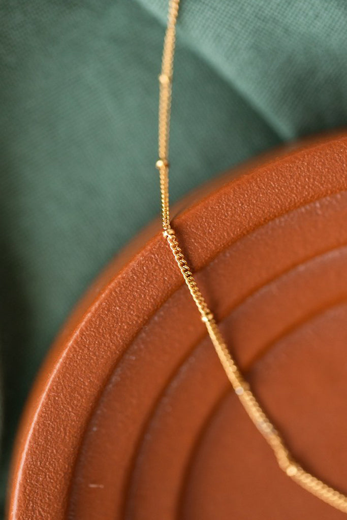 Le collier Pearl est fabriqué à la main dans mon atelier, Il est composé d’une chaîne aux mailles ovales décorée de petites billes dorées,