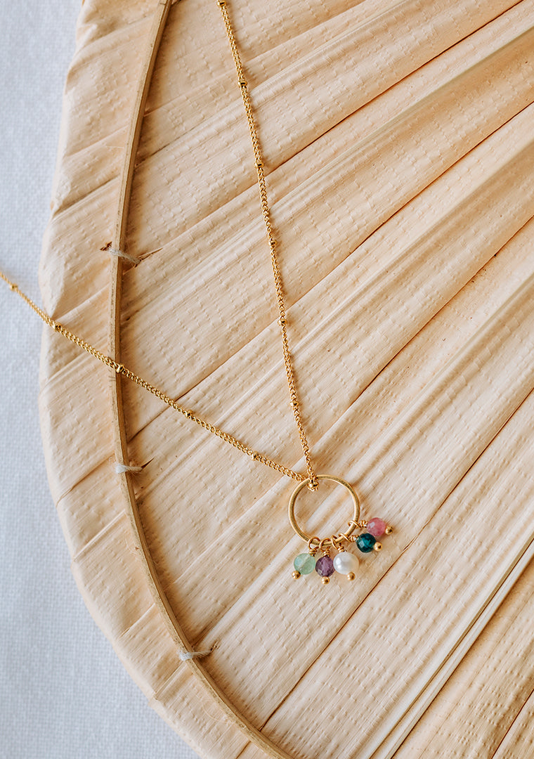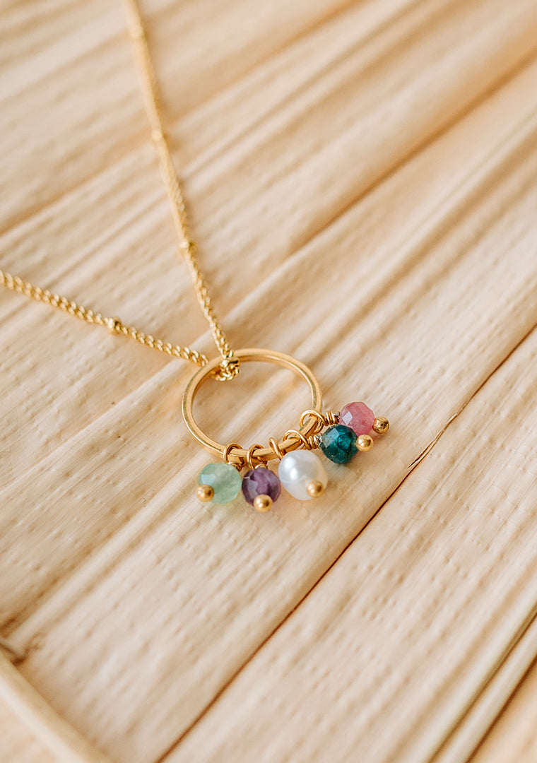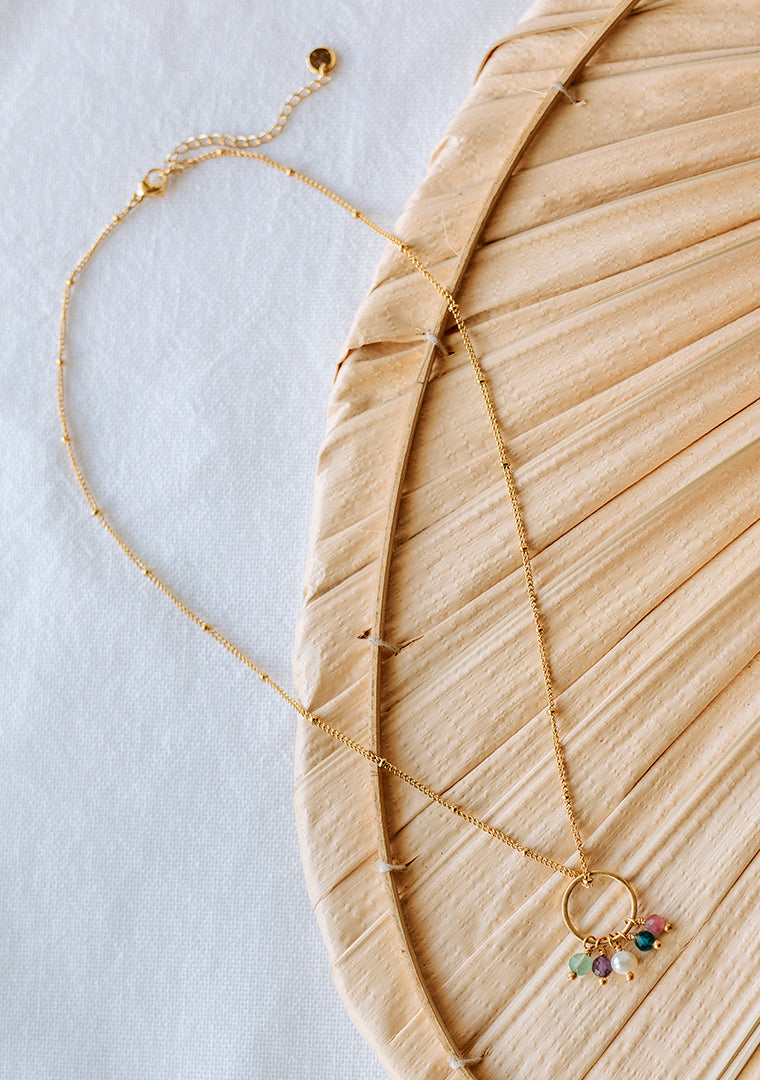 Le collier Perla est fabriqué à la main dans mon atelier, Il est monté sur une fine chaine ornée de petites billes dorées et habillée d’un pendentif circulaire décoré de pierres semi-précieuses et de quelques perles dorée,