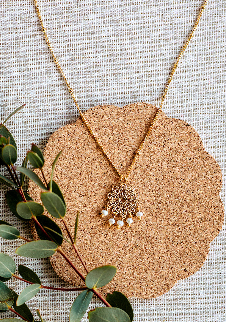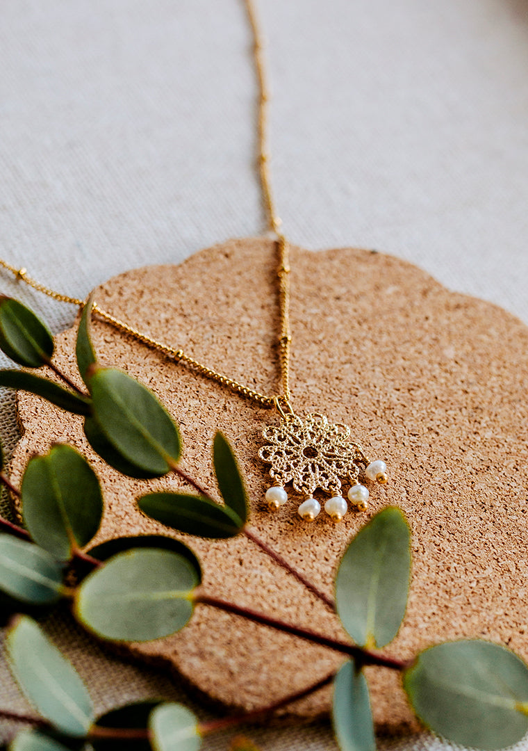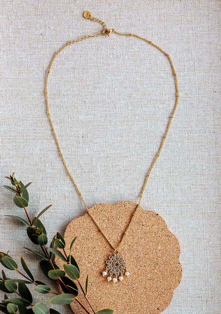 Le collier Selma est fabriqué à la main dans mon atelier, Il est monté sur une chaine décorée de petites billes et orné d’un pendentif byzantin sur lequel sont accrochés des pampilles en Perles d’eau douce,