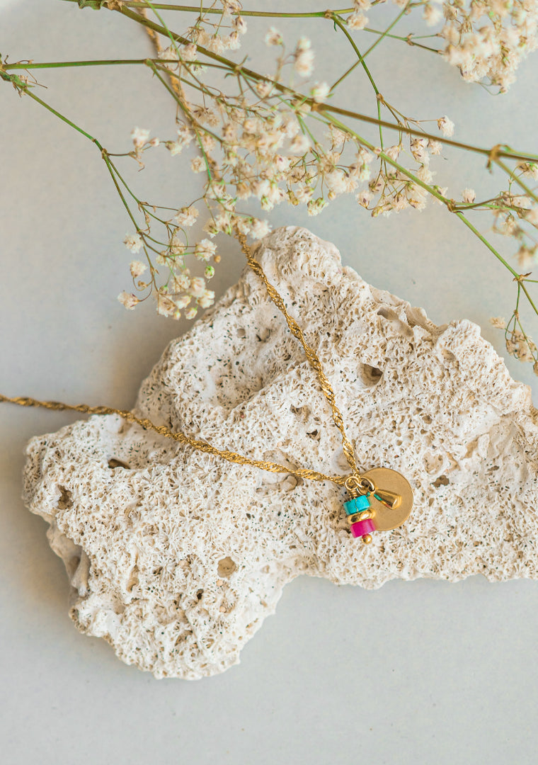 Le collier Seringa est fabriqué à la main dans mon atelier, Il est monté sur une chaine aux maillons torsadés et orné d’une médaille lisse, d’une pampille en forme de goutte et d’un pendentif décoré d’une Turquoise ainsi que d’une Jaspe rose,
