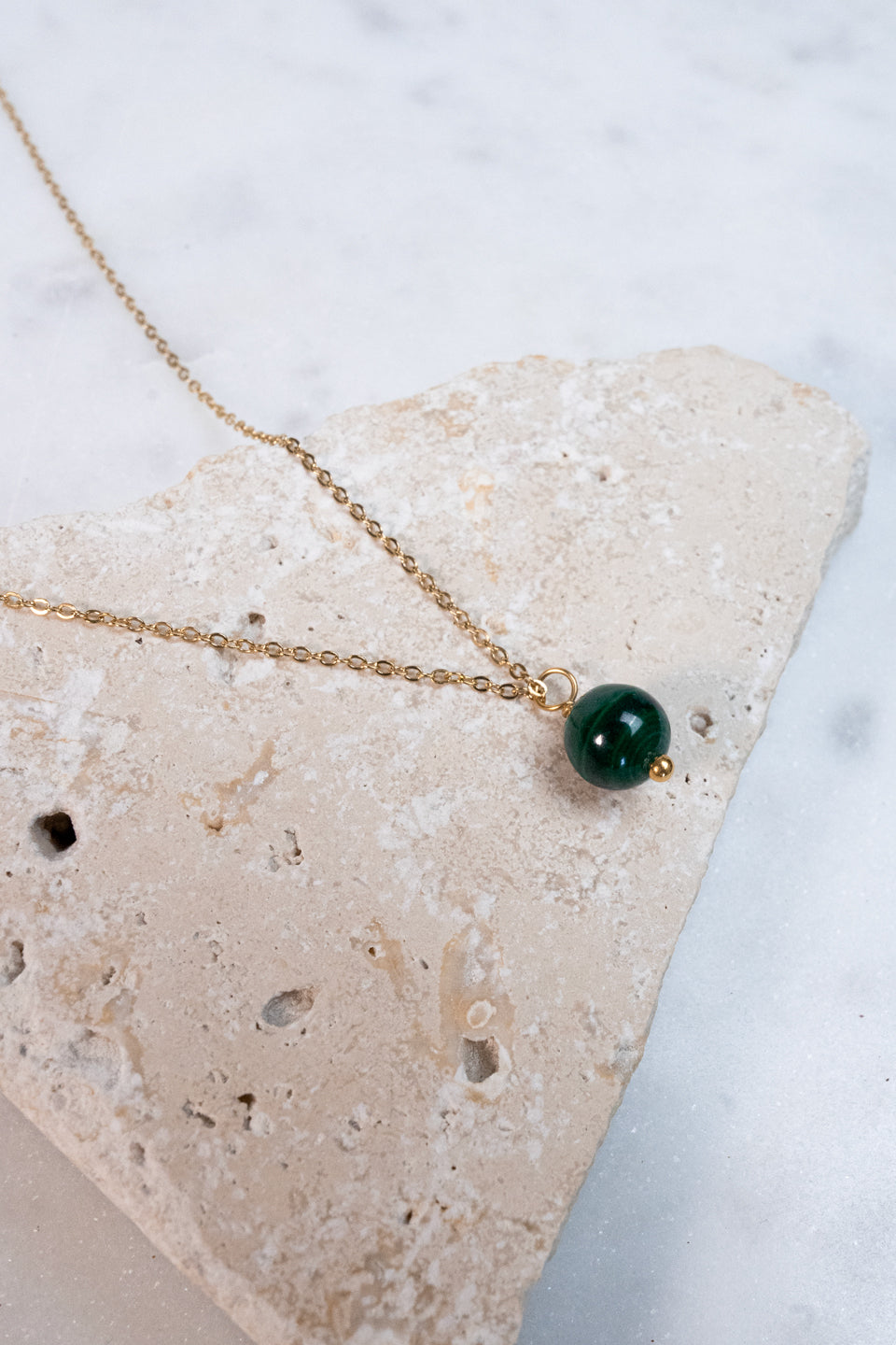Le collier Tina est fabriqué à la main dans mon atelier, Il est monté sur une chaine fine ornée d’une Malachite,