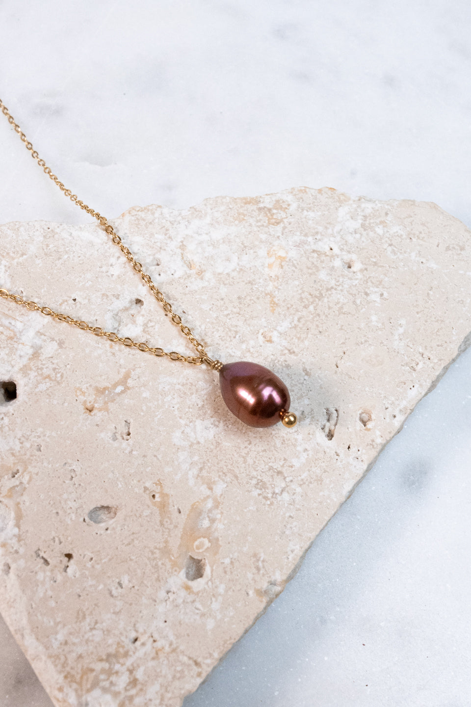 Le collier Tina est fabriqué à la main dans mon atelier, Il est monté sur une chaine fine ornée d’une Perle d’eau douce bordeaux,
