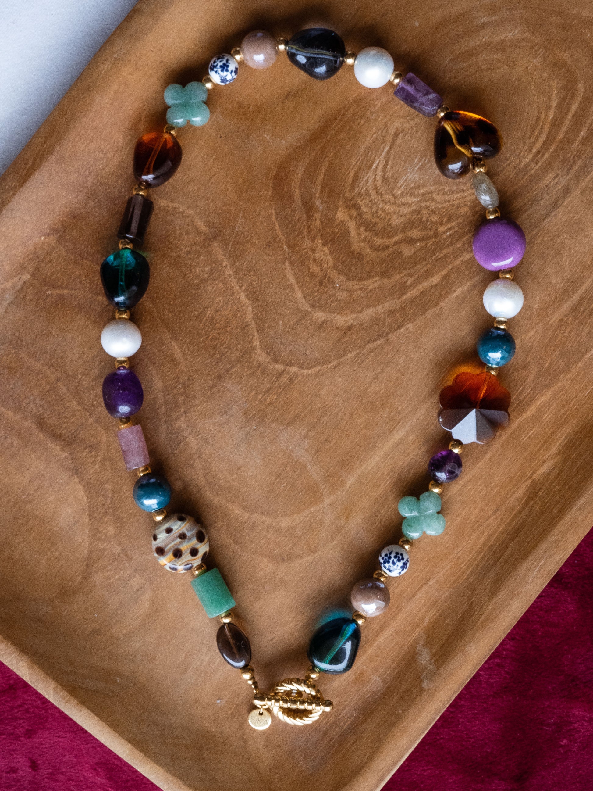 Le collier Ysia est fabriqué à la main dans mon atelier. Il est composé d'une multitude de perles dorées, de pierres semi-précieuses, de perles en céramique, en porcelaine, en résine et en verre.