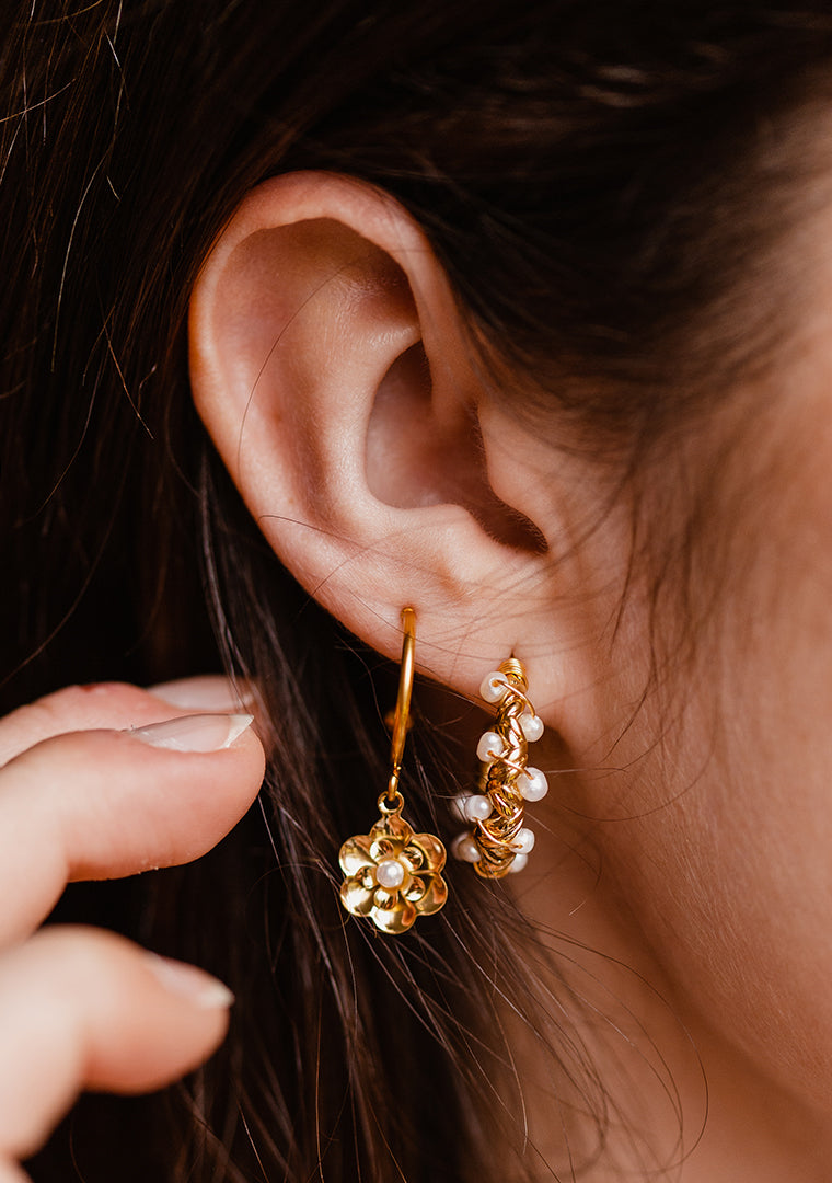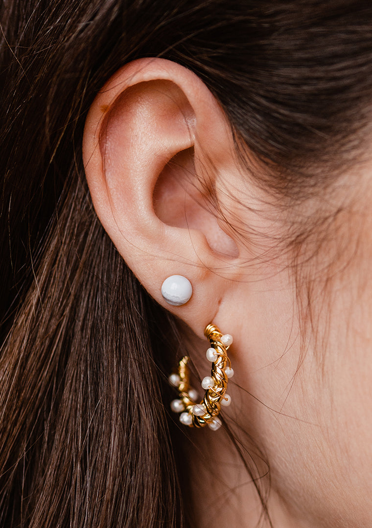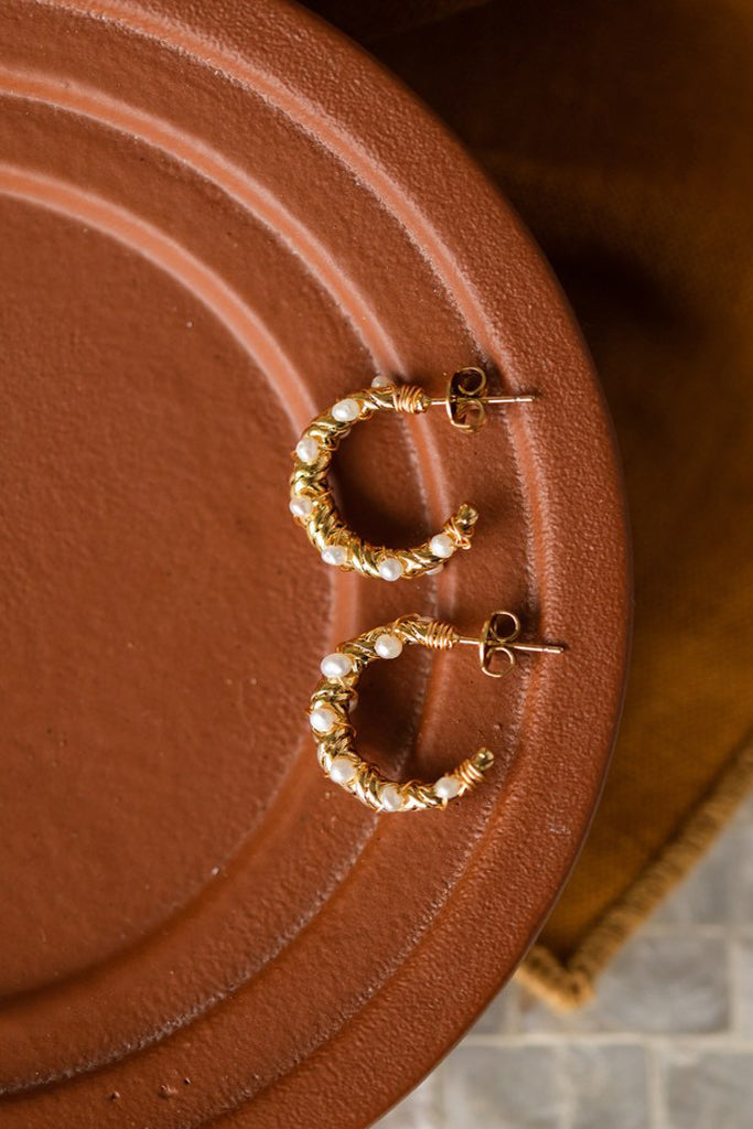 Les petites créoles Amira sont fabriquées à la main dans mon atelier, Elles sont composées de créoles torsadées sur lesquelles sont tissées une multitude de perles d’eau douce,