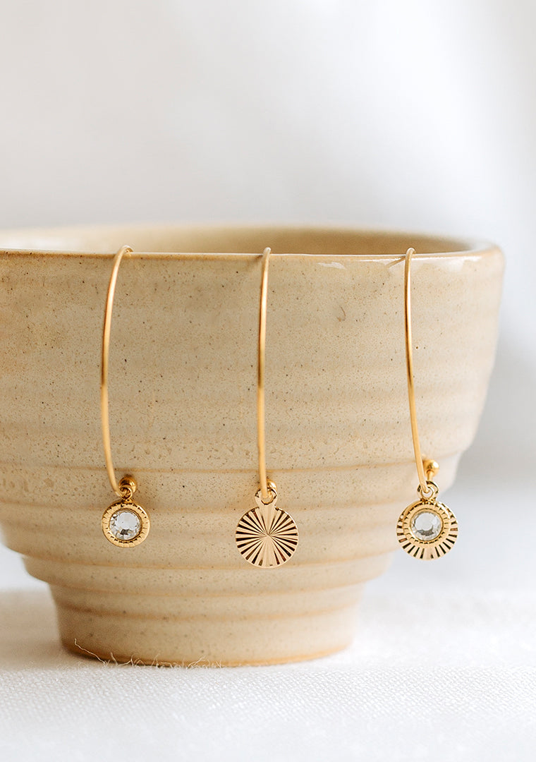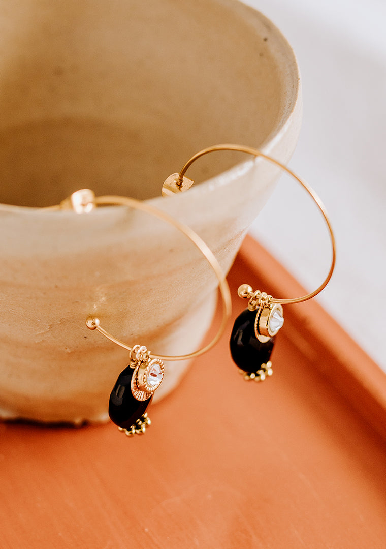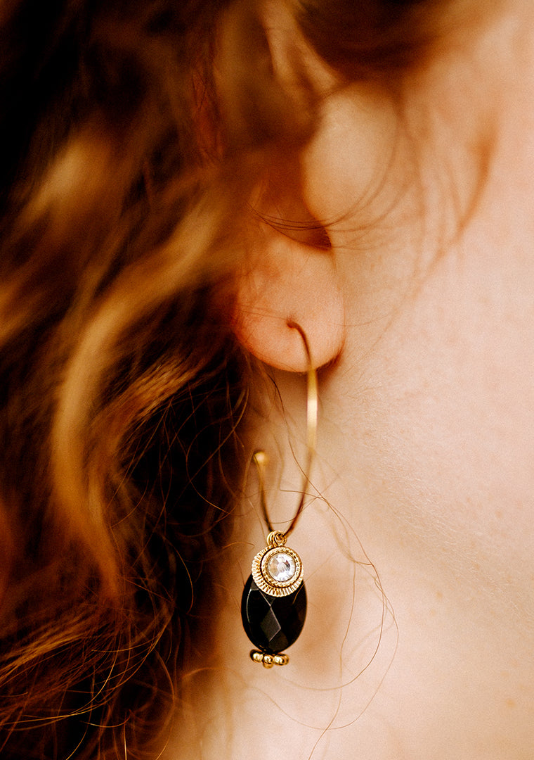 Les créoles Lina sont fabriquées à la main dans mon atelier, Elles sont composées d'une créoles sur laquelle sont attachées des pampilles amovibles (Jade teintée noire, médaille striée et strass)