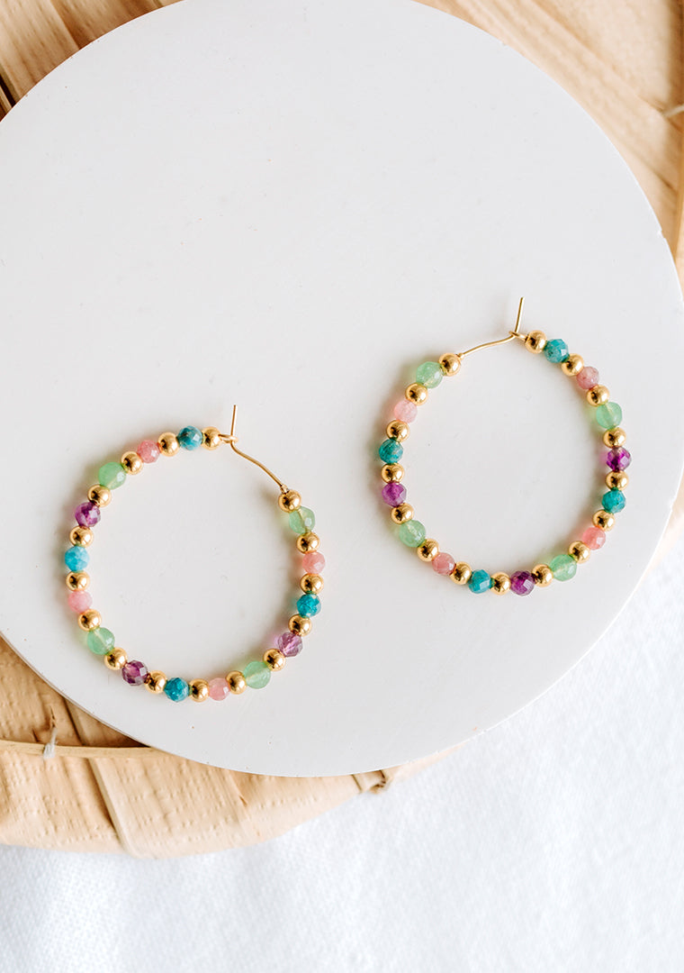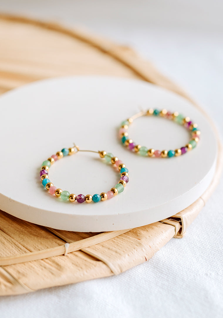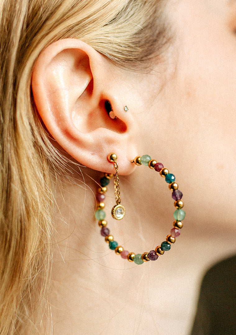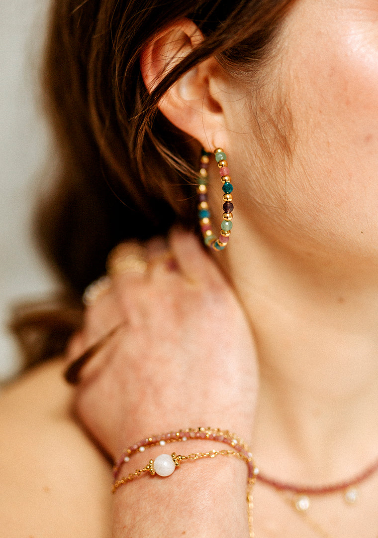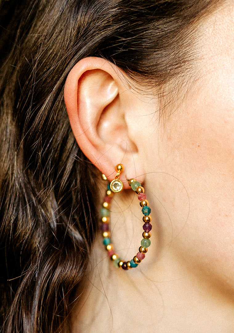 Les créoles Masha sont fabriquées à la main dans mon atelier, Elles sont composées de pierres semi-précieuses et de perles dorées,