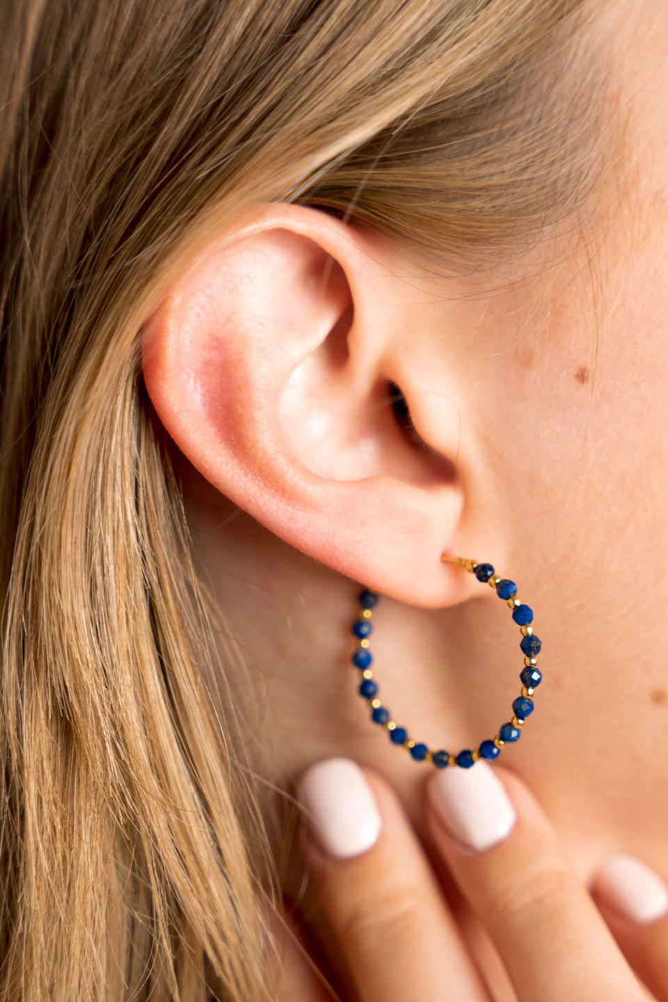 Les créoles Nina sont fabriquées à la main dans mon atelier, Elles sont composées de Lapis-Lazuli et de perles dorées,