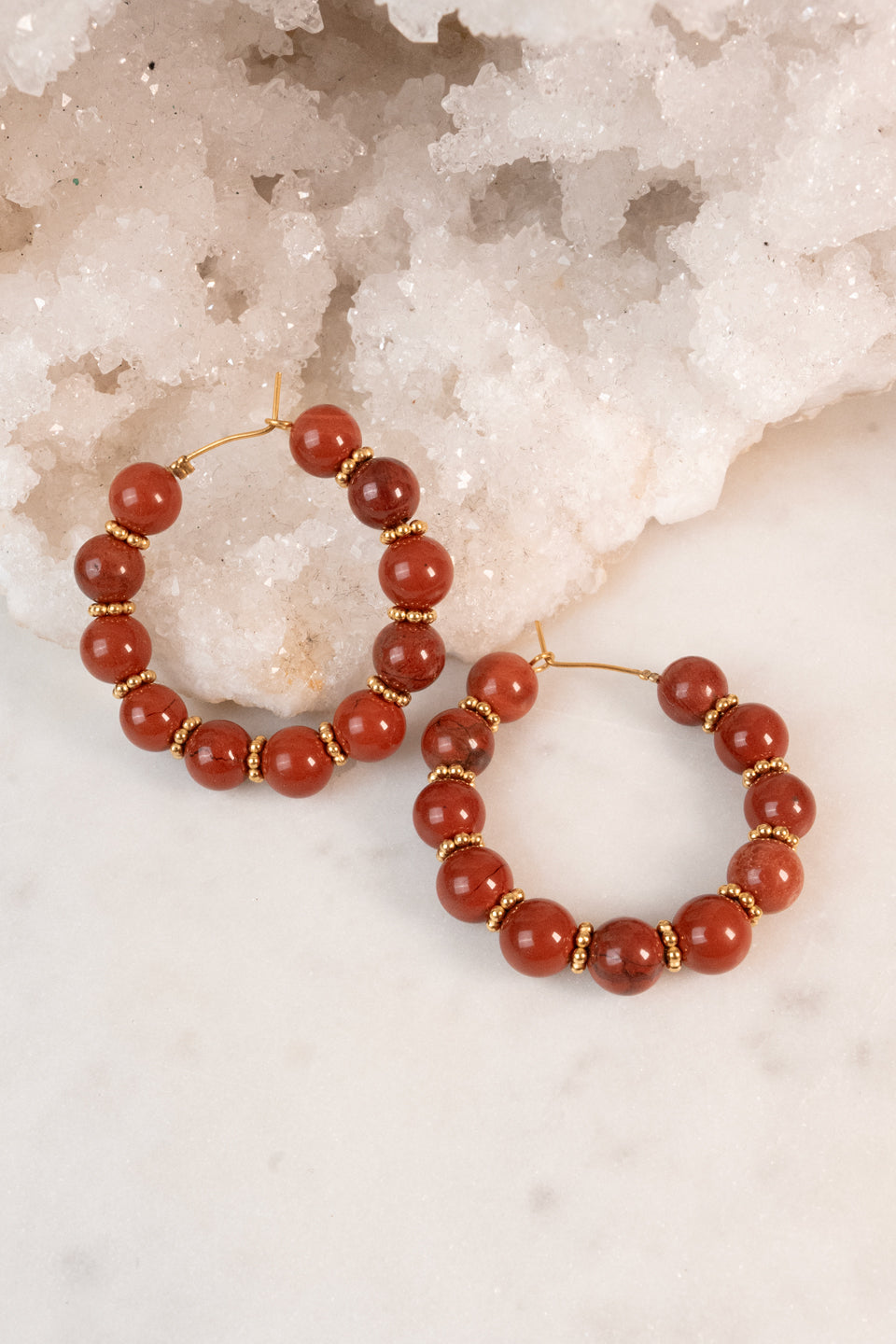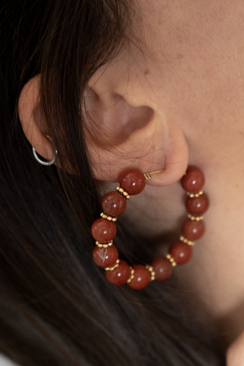 Les créoles Osiris sont fabriqués à la main dans mon atelier, Elles sont composées de perles rondes en Jaspe rouge ainsi que de perles dorées,