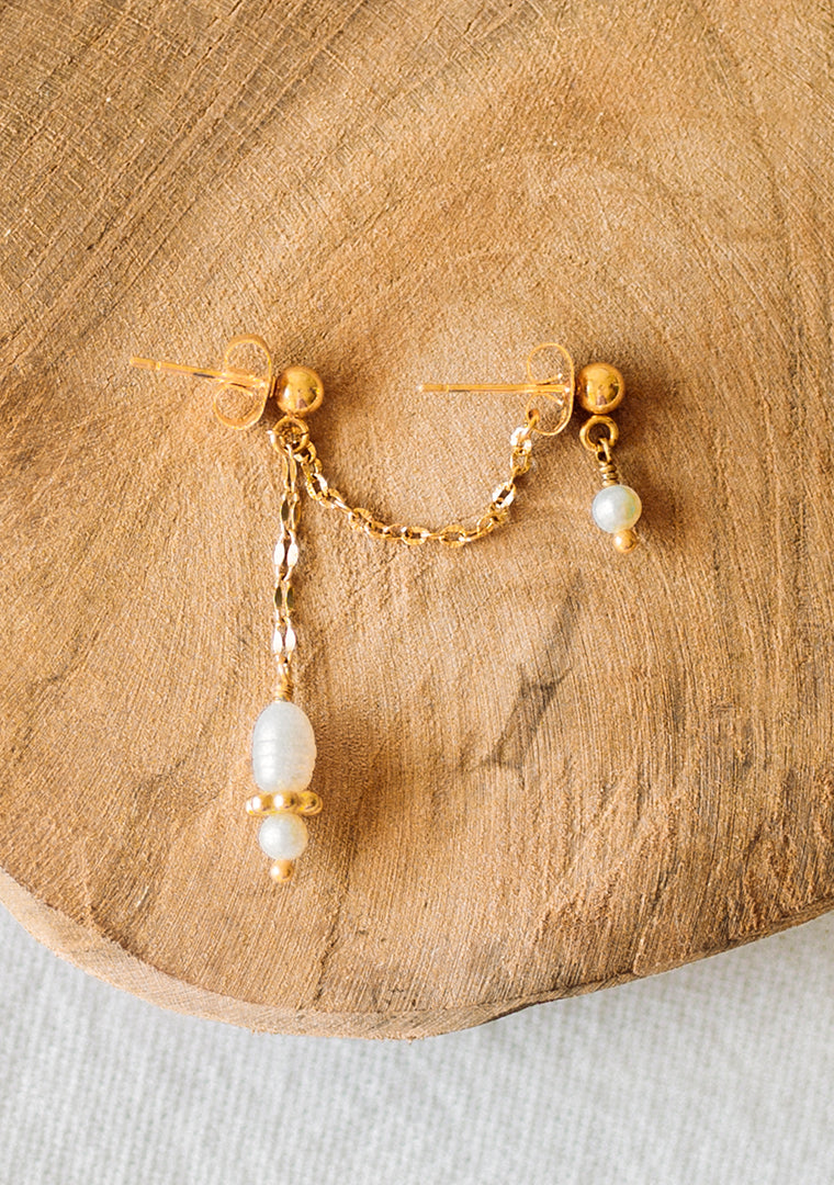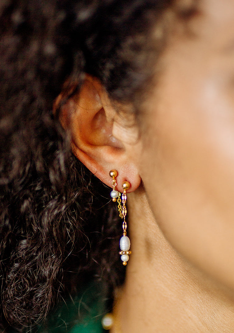 La double boucles d’oreilles Calypso est fabriqué à la main dans mon atelier, Elle est composé d’une double chaines aux maillons ovales striés et lisses, ainsi que de deux pendents décorés de Perles d’eau douce et d’une perle doré,