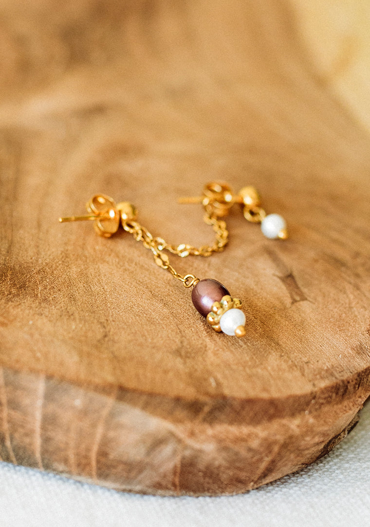 La double boucles d’oreilles Calypso est fabriqué à la main dans mon atelier, Elle est composé d’une double chaines aux maillons ovales striés et lisses, ainsi que de deux pendents décorés de Perles d’eau douce blanches et rose, et d’une perle doré,