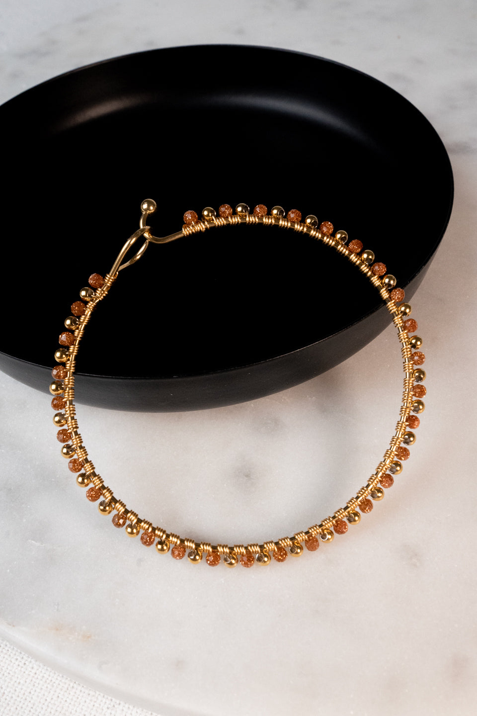 Le jonc Mélina est fabriqué à la main dans mon atelier, Il est composé d’une monture sur laquelle sont tressés une multitude de pierres de soleil et de perles dorées,