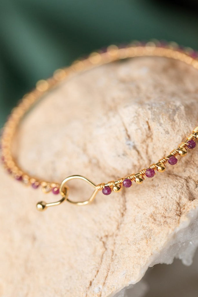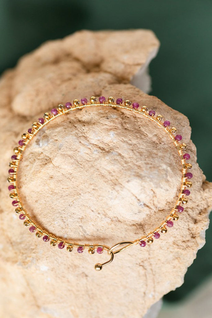 Le jonc Mélina est fabriqué à la main dans mon atelier, Il est composé d’une monture sur laquelle sont tressés une multitude de rubis et de perles dorées,