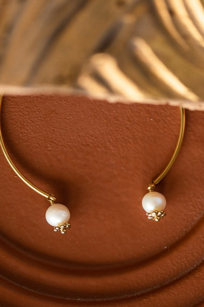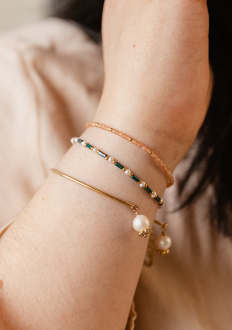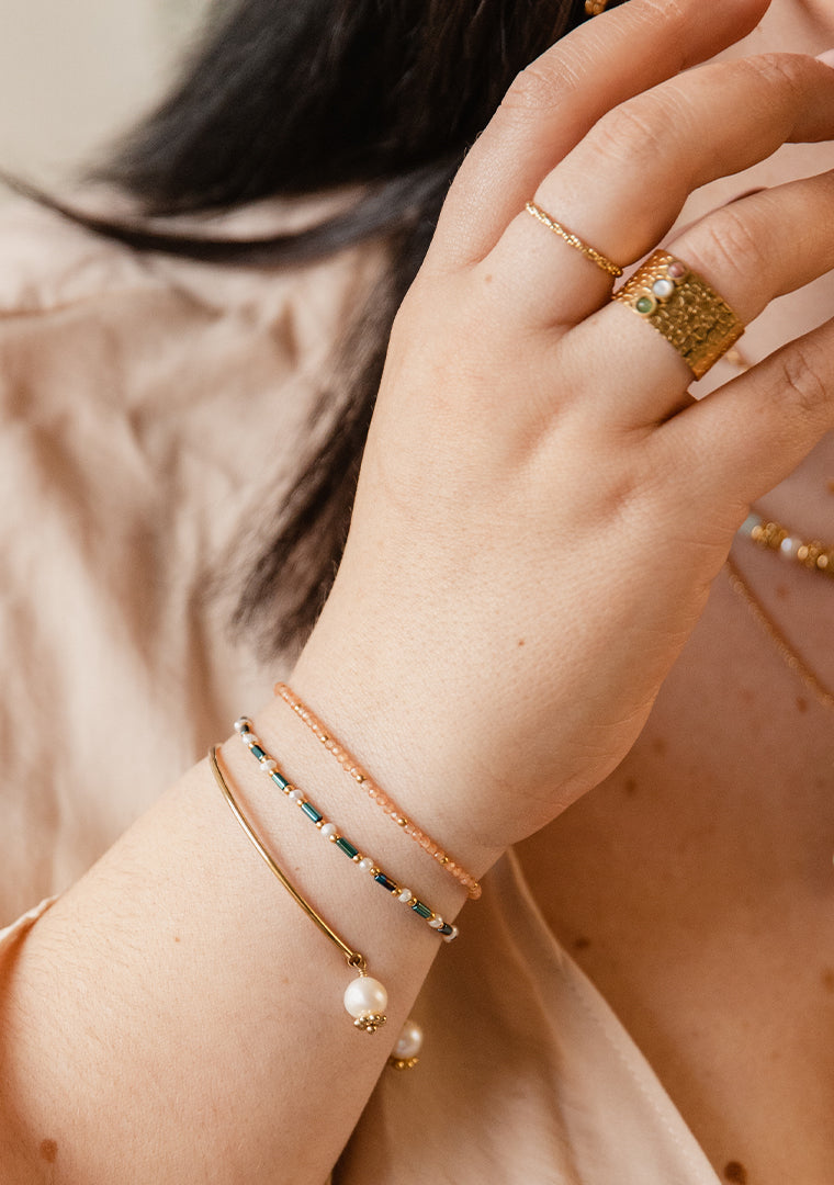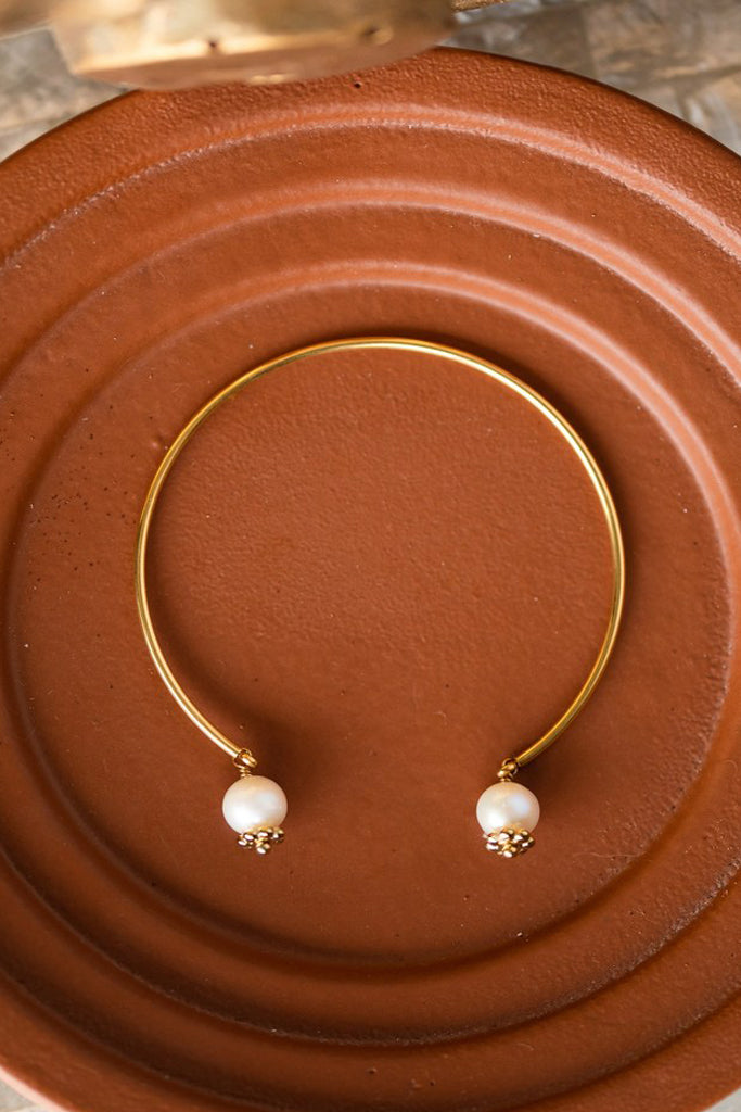 Le jonc Osiris est fabriqué à la main dans mon atelier, Il est décoré de deux pampilles composées d’une perle dorée et d’une perle d’eau douce,,