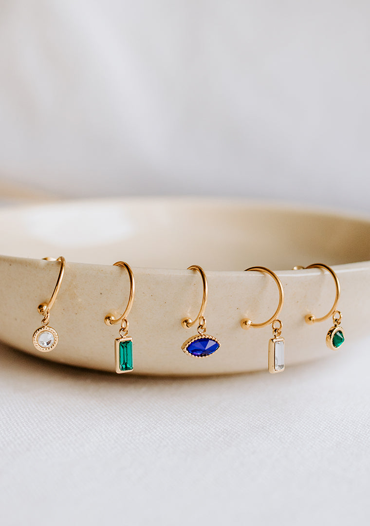 Les mini créoles Luz sont fabriquées à la main dans mon atelier, Elles sont composées d’un pendent décoré d’un strass en forme de cercle ou de rectangle,