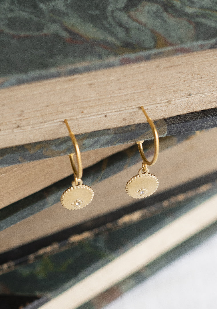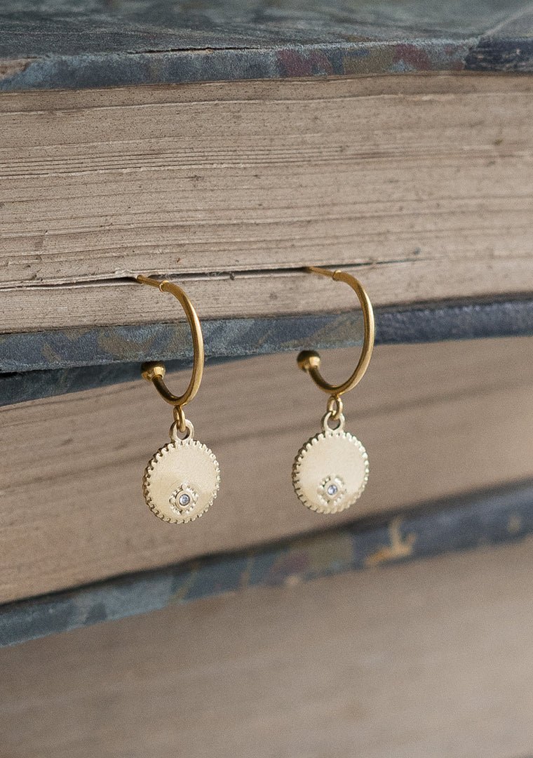Les mini créoles Méline sont fabriquées à la main dans mon atelier, Elles sont ornées d’une médaille incrustée d’un strass,