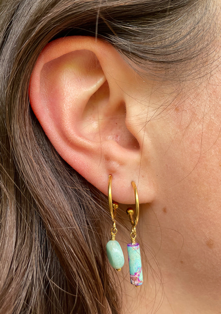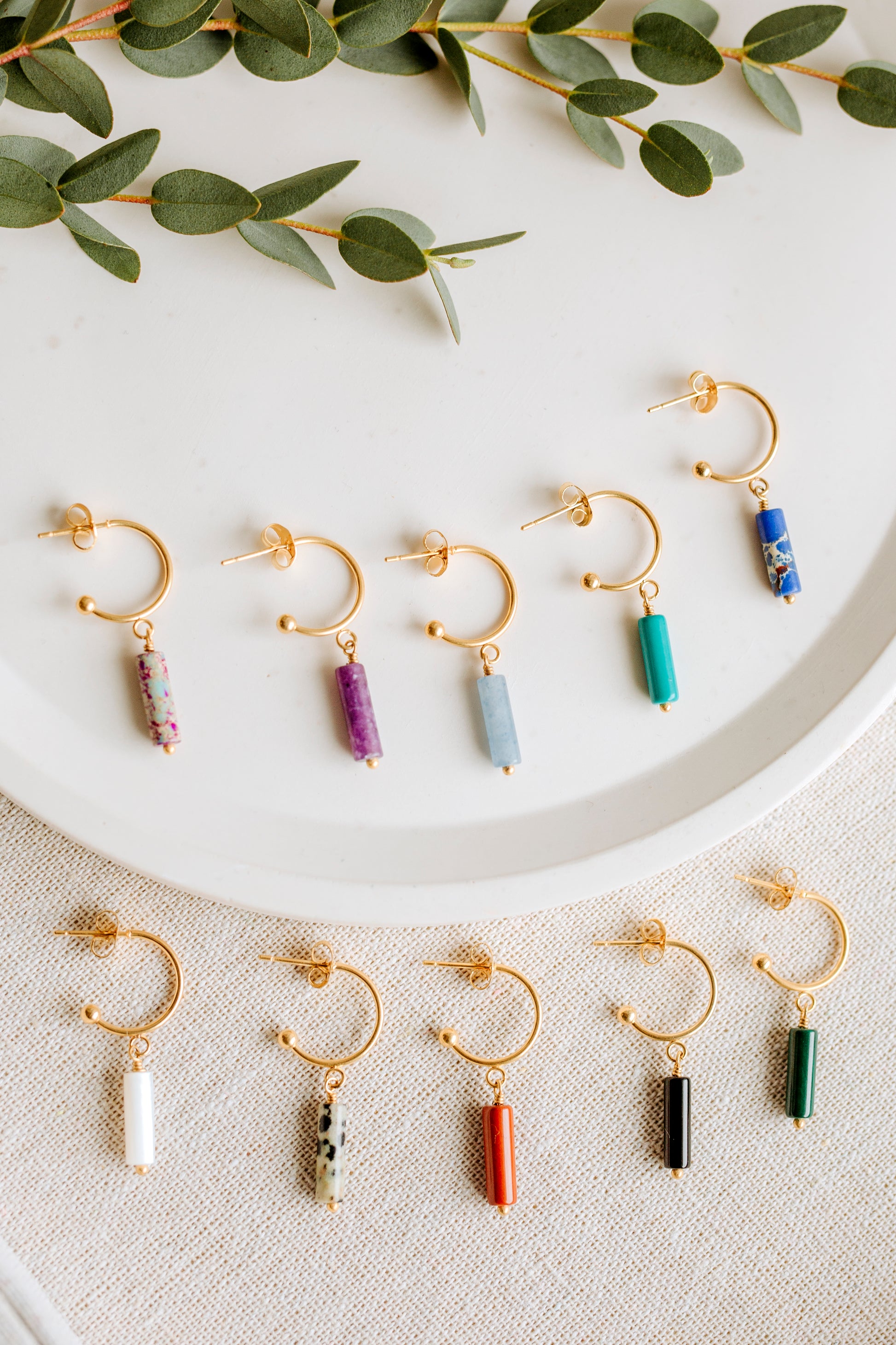 Les mini créoles Noé sont fabriquées à la main dans mon atelier, Elles sont composées d’un pendent en pierre semi-précieuses, au choix :