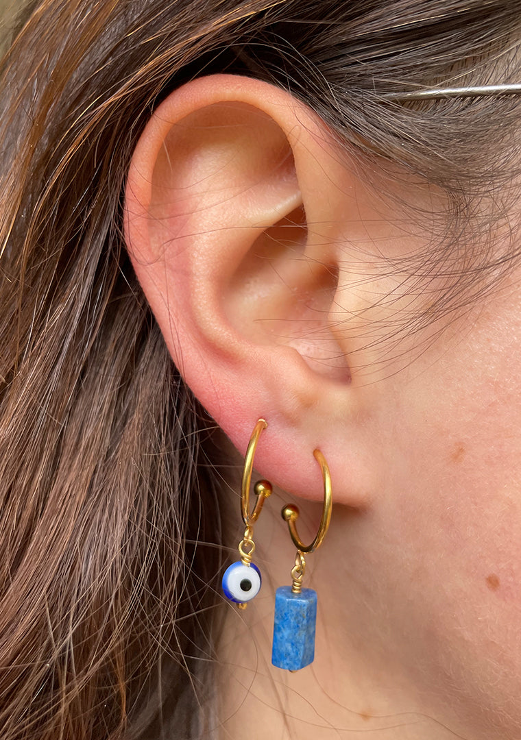 Les mini créoles Oja sont fabriquées à la main dans mon atelier, Elles sont composées d’un pendent orné d’une perle de verre représentant un oeil Grec dont la couleur est au choix :