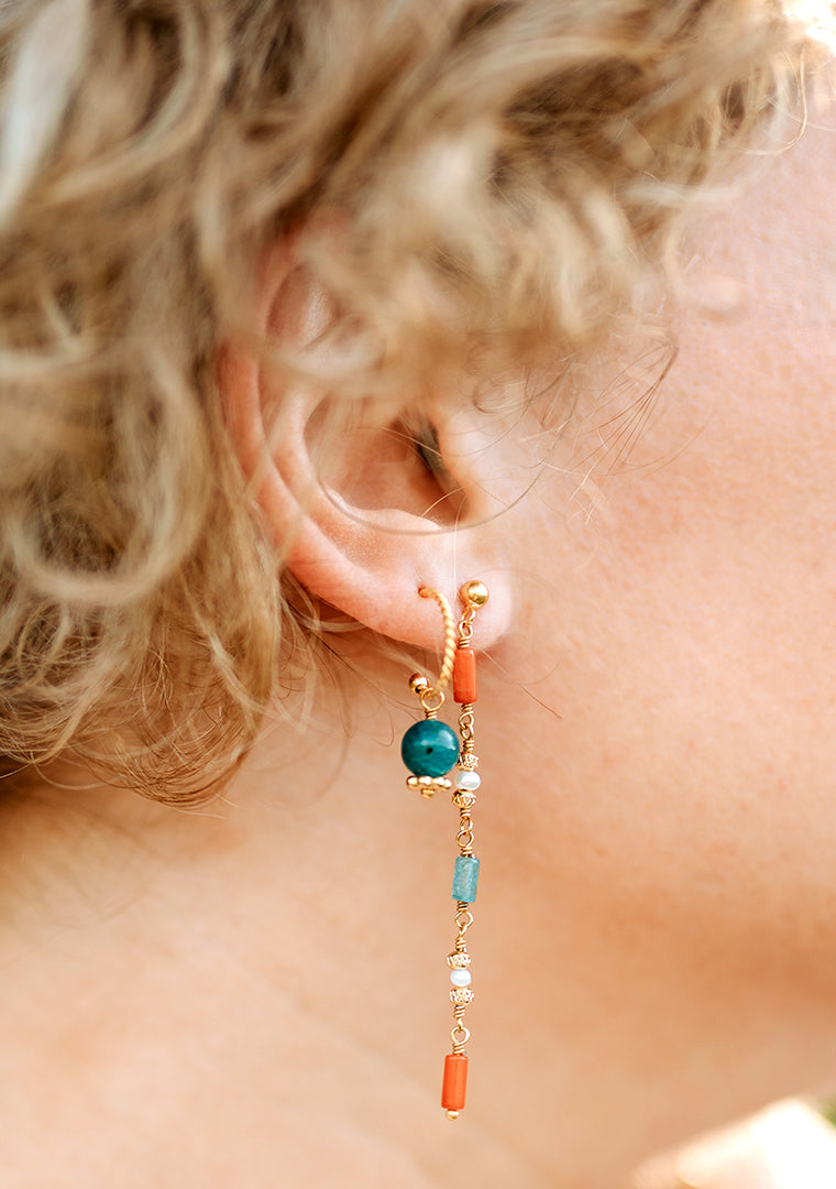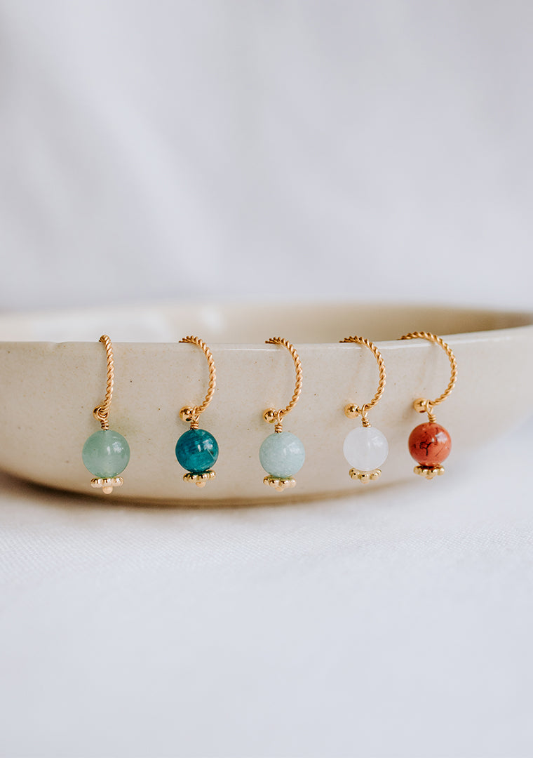 Les mini créoles Osiris sont fabriquées à la main dans mon atelier, Elles sont montées sur un support torsadé et décorées d’un pendent amovible dont la pierre semi-précieuse est au choix :